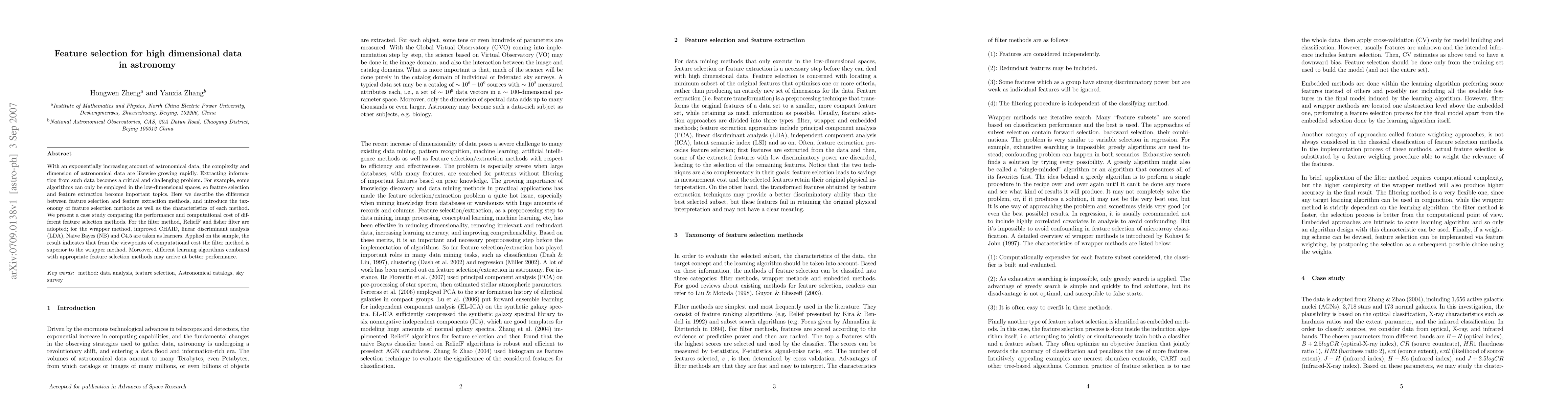 This paper explores feature selection methods for high-dimensional astronomical data, comparing filter and wrapper approaches. Results show that filter methods like ReliefF and fisher filter are more cost-effective, while different learning algorithms combined with appropriate feature selection can yield better performance.