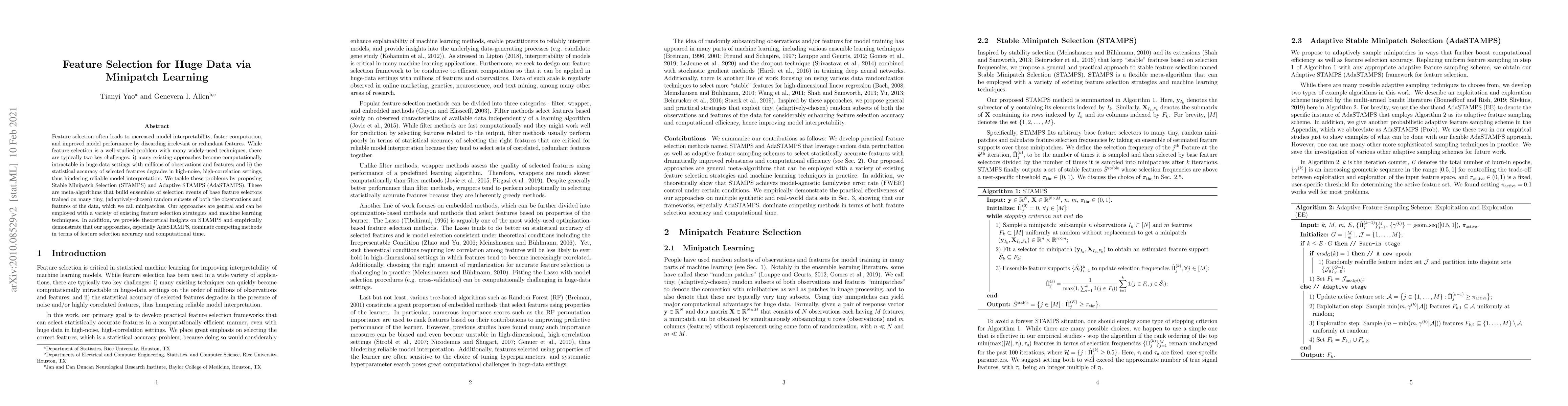 The paper proposes Stable Minipatch Selection (STAMPS) and Adaptive STAMPS (AdaSTAMPS) to address computational and accuracy challenges in feature selection for huge datasets. These meta-algorithms build ensembles from base feature selectors trained on small, adaptively-chosen random subsets of data, called minipatches, and outperform existing methods in accuracy and efficiency.
