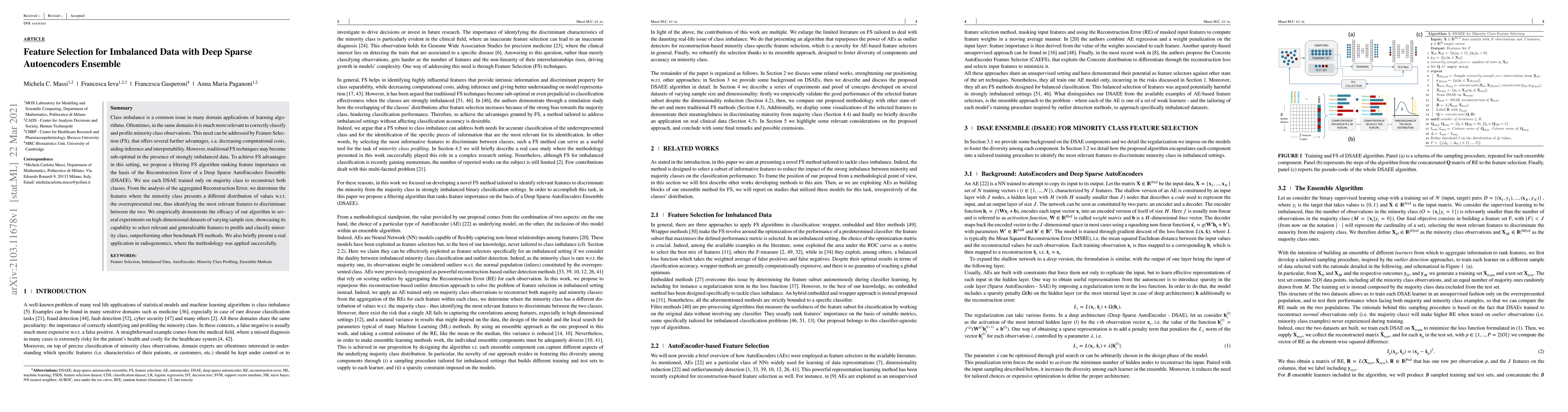 This paper proposes a feature selection algorithm that uses deep sparse autoencoders to identify relevant features for imbalanced data, outperforming other methods in several experiments.