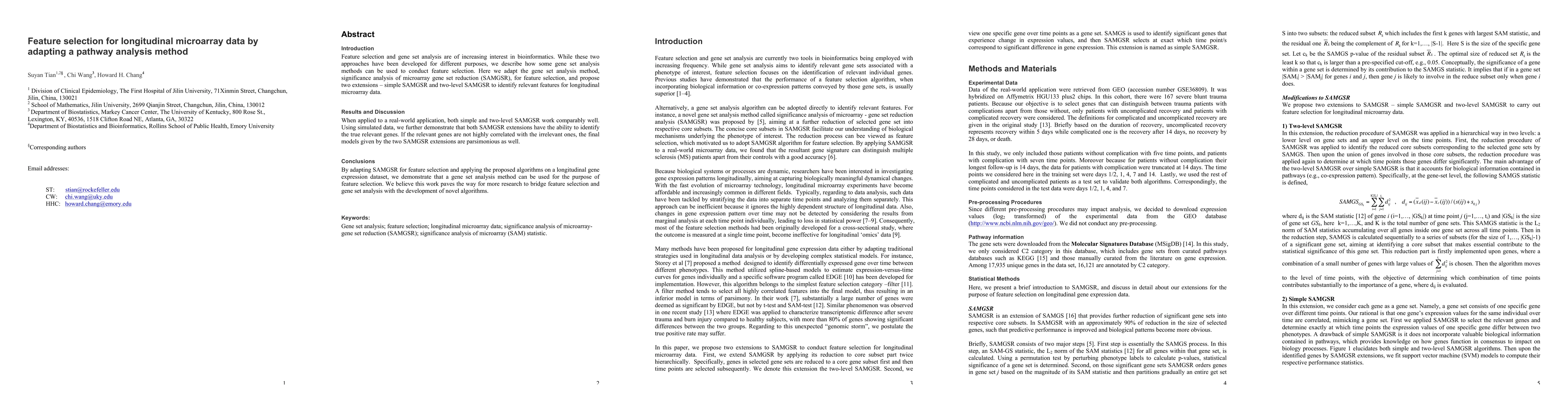 This paper adapts the gene set analysis method SAMGSR for feature selection in longitudinal microarray data, proposing two extensions—simple SAMGSR and two-level SAMGSR. Both methods show comparable effectiveness in identifying relevant features and demonstrate good performance on both real and simulated data.