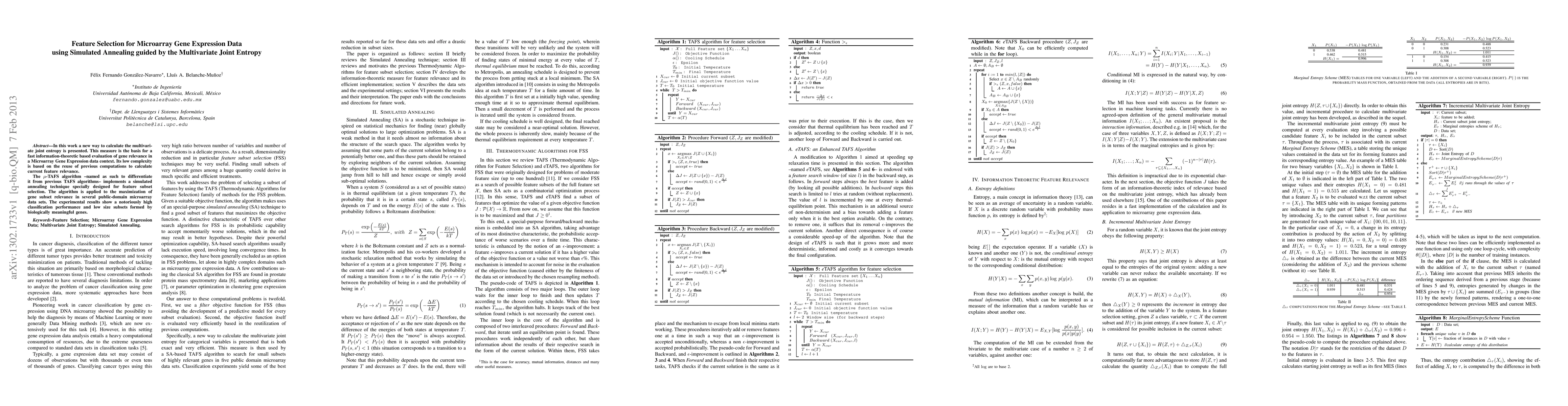 This paper proposes a novel method for calculating multivariate joint entropy, which is used to evaluate gene relevance in microarray data. The mu-TAFS algorithm, employing simulated annealing, selects optimal gene subsets that maximize relevance and demonstrate high classification performance with meaningful biological genes.