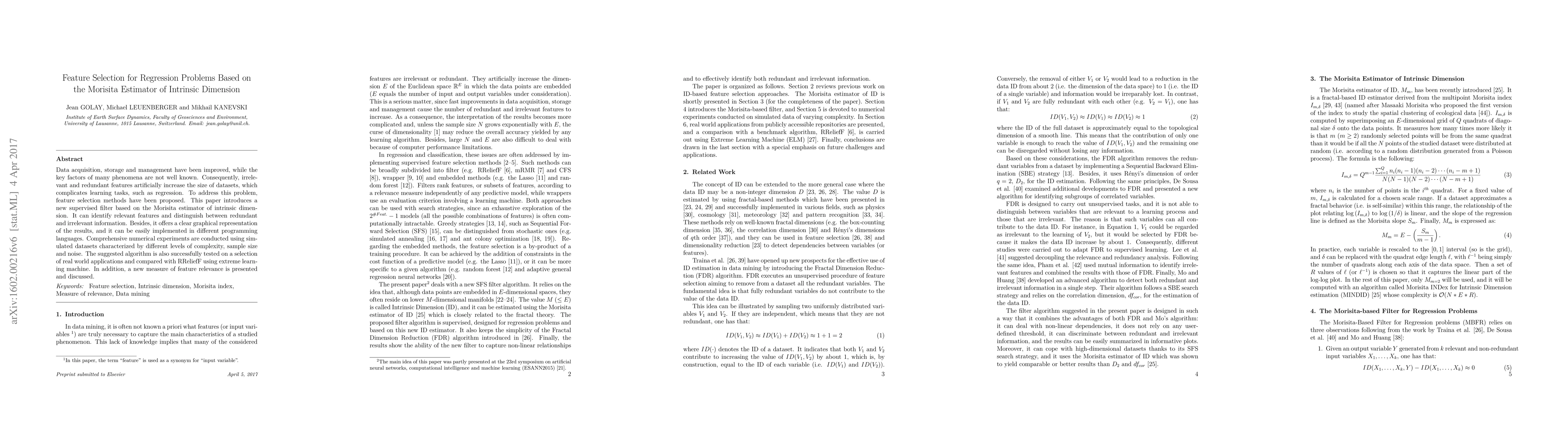 Data acquisition, storage and management have been improved, while the key factors of many phenomena are not well known. Consequently, irrelevant and redundant features artificially increase the size of datasets, which complicates learning tasks, such as regression. To address this problem, feature selection methods have been proposed. This paper introduces a new supervised filter based on the Morisita estimator of intrinsic dimension. It can identify relevant features and distinguish between redundant and irrelevant information. Besides, it offers a clear graphical representation of the results, and it can be easily implemented in different programming languages. Comprehensive numerical experiments are conducted using simulated datasets characterized by different levels of complexity, sample size and noise. The suggested algorithm is also successfully tested on a selection of real world applications and compared with RReliefF using extreme learning machine. In addition, a new measure of feature relevance is presented and discussed.