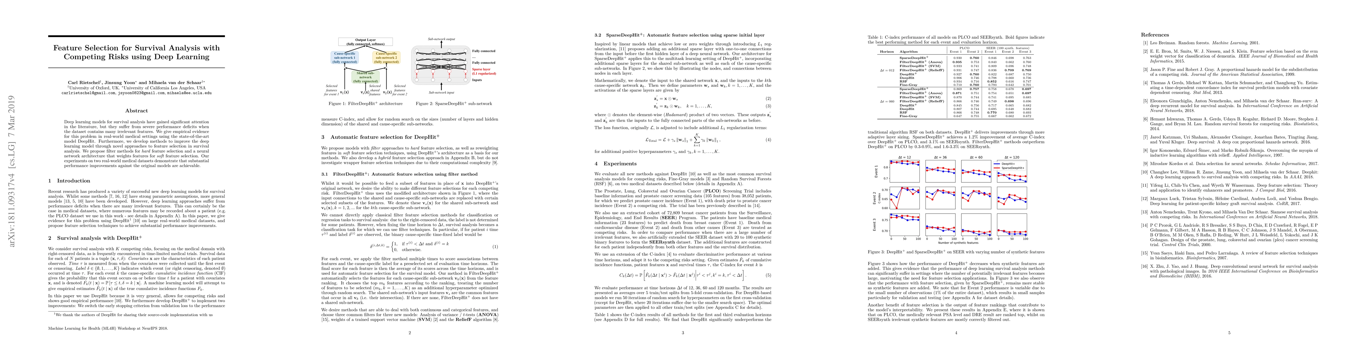 This paper addresses performance deficits in deep learning models for survival analysis, particularly in the presence of irrelevant features. It proposes novel feature selection methods, including filter-based hard selection and a neural network-based soft feature weighting approach, which significantly improve model performance on real-world medical datasets.
