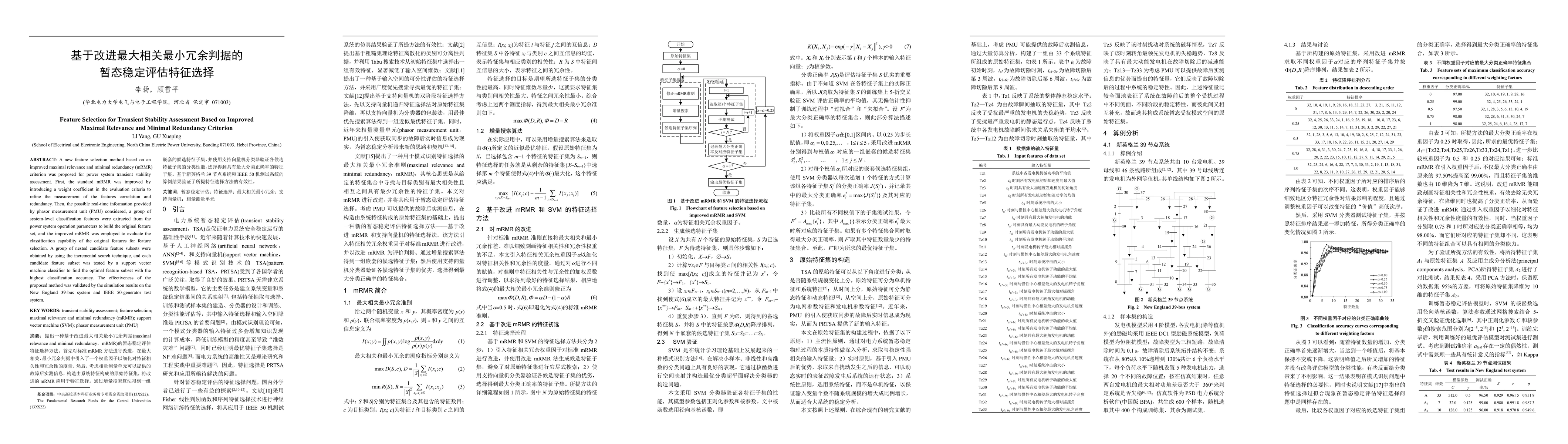 A new feature selection method based on an improved maximal relevance and minimal redundancy (mRMR) criterion was proposed for power system transient stability assessment. First, the standard mRMR was improved by introducing a weight coefficient in the evaluation criteria to refine the measurement of the features correlation and redundancy. Then, the possible real-time information provided by phasor measurement unit (PMU) considered, a group of system-level classification features were extracted from the power system operation parameters to build the original feature set, and the improved mRMR was employed to evaluate the classification capability of the original features for feature selection. A group of nested candidate feature subsets were obtained by using the incremental search technique, and each candidate feature subset was tested by a support vector machine classifier to find the optimal feature subset with the highest classification accuracy. The effectiveness of the proposed method was validated by the simulation results on the New England 39-bus system and IEEE 50-generator test system.