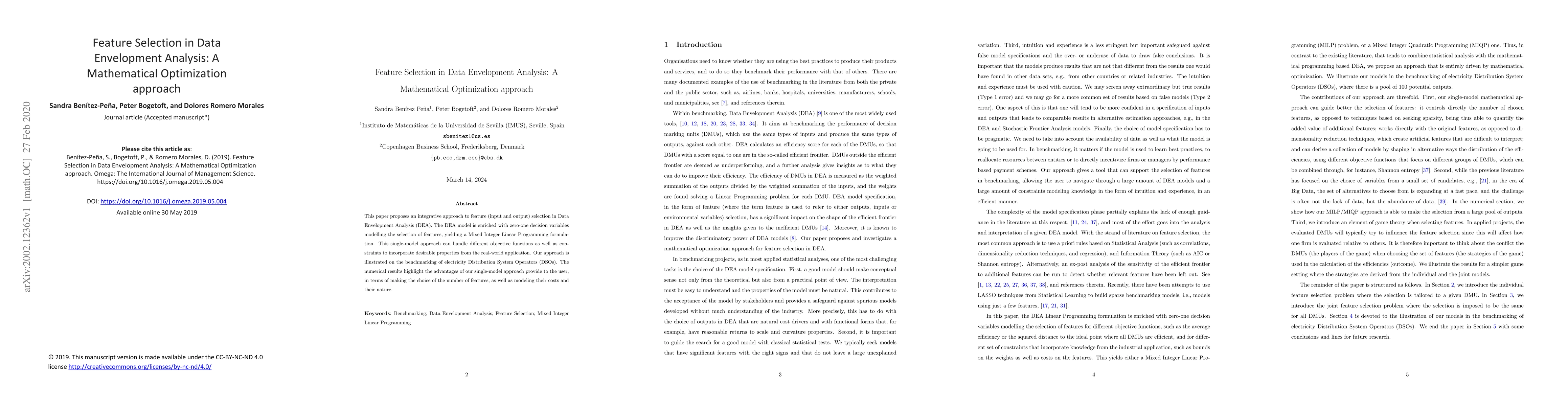 This paper introduces a mathematical optimization approach for feature selection in Data Envelopment Analysis (DEA), using a Mixed Integer Linear Programming formulation to model the selection of inputs and outputs. The method is demonstrated through the benchmarking of electricity Distribution System Operators, showcasing its flexibility and advantages in feature choice and cost modeling.