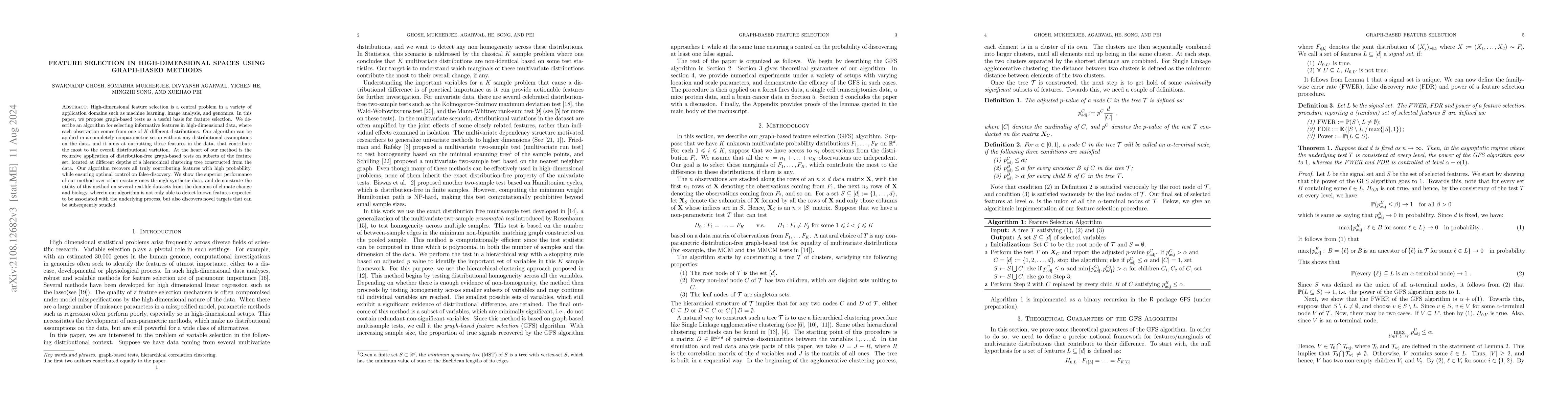High-dimensional feature selection is a central problem in a variety of application domains such as machine learning, image analysis, and genomics. In this paper, we propose graph-based tests as a useful basis for feature selection. We describe an algorithm for selecting informative features in high-dimensional data, where each observation comes from one of $K$ different distributions. Our algorithm can be applied in a completely nonparametric setup without any distributional assumptions on the data, and it aims at outputting those features in the data, that contribute the most to the overall distributional variation. At the heart of our method is the recursive application of distribution-free graph-based tests on subsets of the feature set, located at different depths of a hierarchical clustering tree constructed from the data. Our algorithm recovers all truly contributing features with high probability, while ensuring optimal control on false-discovery. Finally, we show the superior performance of our method over other existing ones through synthetic data, and also demonstrate the utility of the method on two real-life datasets from the domains of climate change and single cell transcriptomics.