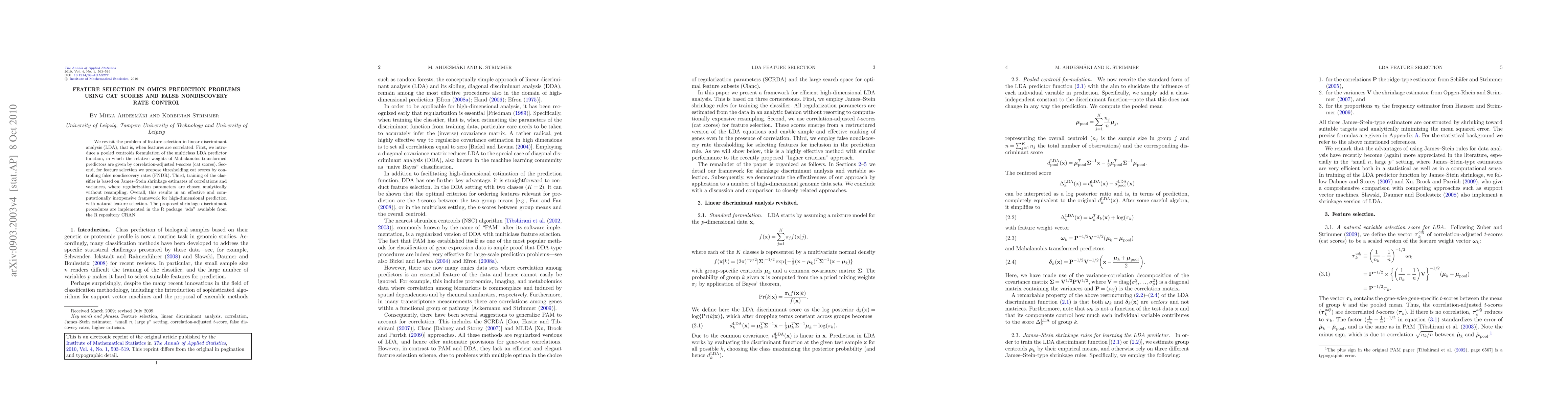 This paper proposes a method for feature selection in linear discriminant analysis (LDA) using correlation-adjusted t-scores (cat scores) and false nondiscovery rate control. It introduces a pooled centroids formulation and analytically determines regularization parameters for effective high-dimensional prediction.