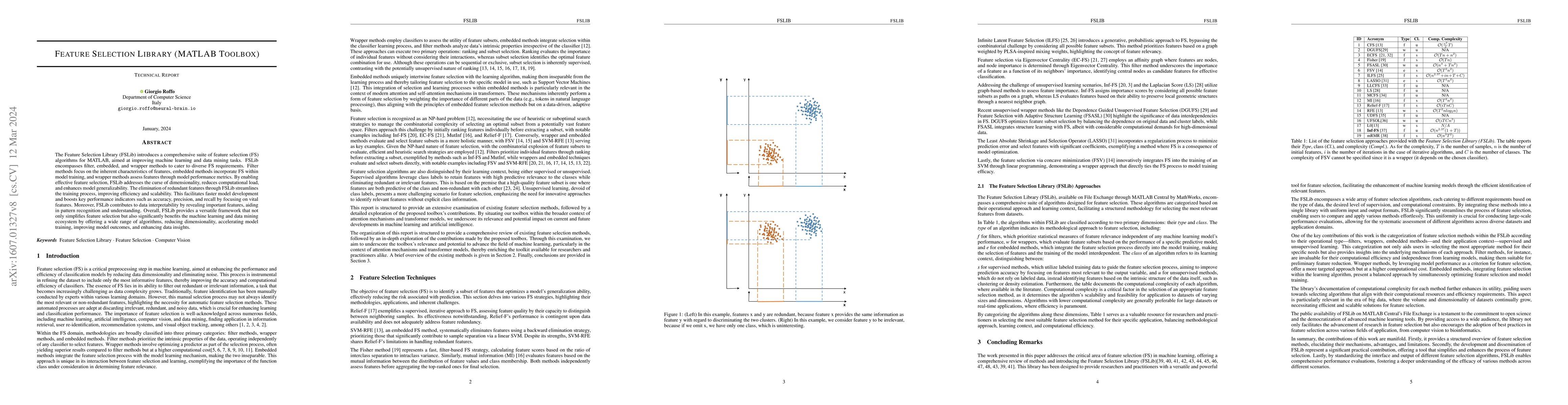 The Feature Selection Library (FSLib) introduces a comprehensive suite of feature selection (FS) algorithms for MATLAB, aimed at improving machine learning and data mining tasks. FSLib encompasses filter, embedded, and wrapper methods to cater to diverse FS requirements. Filter methods focus on the inherent characteristics of features, embedded methods incorporate FS within model training, and wrapper methods assess features through model performance metrics. By enabling effective feature selection, FSLib addresses the curse of dimensionality, reduces computational load, and enhances model generalizability. The elimination of redundant features through FSLib streamlines the training process, improving efficiency and scalability. This facilitates faster model development and boosts key performance indicators such as accuracy, precision, and recall by focusing on vital features. Moreover, FSLib contributes to data interpretability by revealing important features, aiding in pattern recognition and understanding. Overall, FSLib provides a versatile framework that not only simplifies feature selection but also significantly benefits the machine learning and data mining ecosystem by offering a wide range of algorithms, reducing dimensionality, accelerating model training, improving model outcomes, and enhancing data insights.