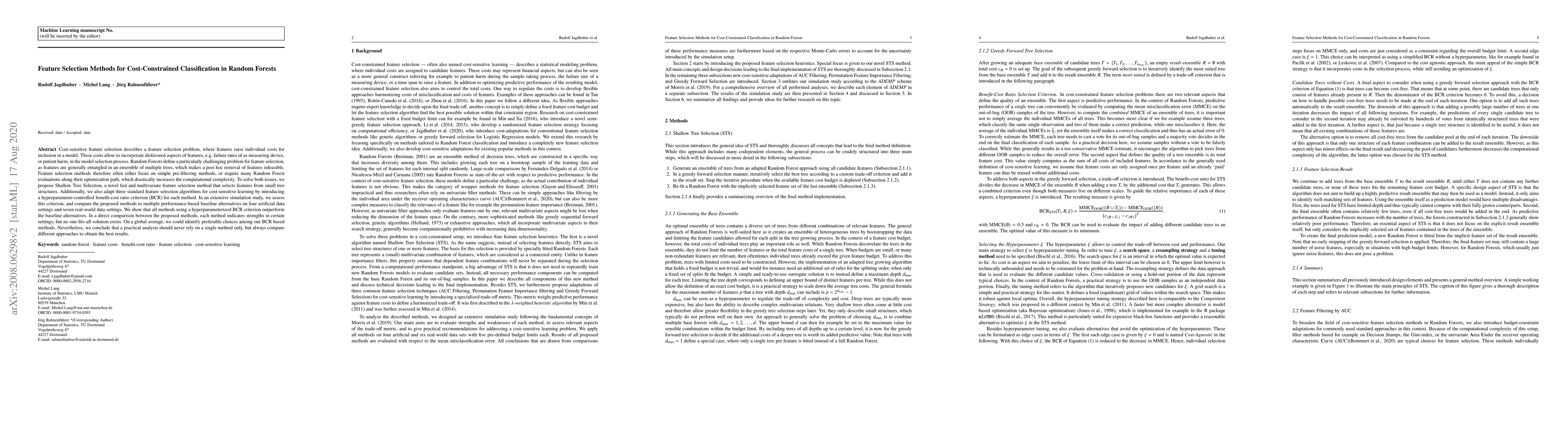Cost-sensitive feature selection describes a feature selection problem, where features raise individual costs for inclusion in a model. These costs allow to incorporate disfavored aspects of features, e.g. failure rates of as measuring device, or patient harm, in the model selection process. Random Forests define a particularly challenging problem for feature selection, as features are generally entangled in an ensemble of multiple trees, which makes a post hoc removal of features infeasible. Feature selection methods therefore often either focus on simple pre-filtering methods, or require many Random Forest evaluations along their optimization path, which drastically increases the computational complexity. To solve both issues, we propose Shallow Tree Selection, a novel fast and multivariate feature selection method that selects features from small tree structures. Additionally, we also adapt three standard feature selection algorithms for cost-sensitive learning by introducing a hyperparameter-controlled benefit-cost ratio criterion (BCR) for each method. In an extensive simulation study, we assess this criterion, and compare the proposed methods to multiple performance-based baseline alternatives on four artificial data settings and seven real-world data settings. We show that all methods using a hyperparameterized BCR criterion outperform the baseline alternatives. In a direct comparison between the proposed methods, each method indicates strengths in certain settings, but no one-fits-all solution exists. On a global average, we could identify preferable choices among our BCR based methods. Nevertheless, we conclude that a practical analysis should never rely on a single method only, but always compare different approaches to obtain the best results.