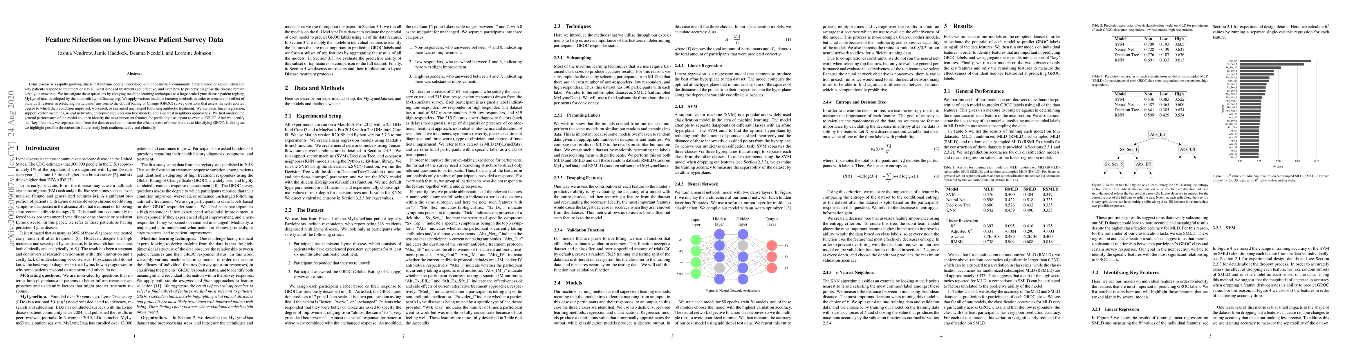 Lyme disease is a rapidly growing illness that remains poorly understood within the medical community. Critical questions about when and why patients respond to treatment or stay ill, what kinds of treatments are effective, and even how to properly diagnose the disease remain largely unanswered. We investigate these questions by applying machine learning techniques to a large scale Lyme disease patient registry, MyLymeData, developed by the nonprofit LymeDisease.org. We apply various machine learning methods in order to measure the effect of individual features in predicting participants' answers to the Global Rating of Change (GROC) survey questions that assess the self-reported degree to which their condition improved, worsened, or remained unchanged following antibiotic treatment. We use basic linear regression, support vector machines, neural networks, entropy-based decision tree models, and $k$-nearest neighbors approaches. We first analyze the general performance of the model and then identify the most important features for predicting participant answers to GROC. After we identify the "key" features, we separate them from the dataset and demonstrate the effectiveness of these features at identifying GROC. In doing so, we highlight possible directions for future study both mathematically and clinically.