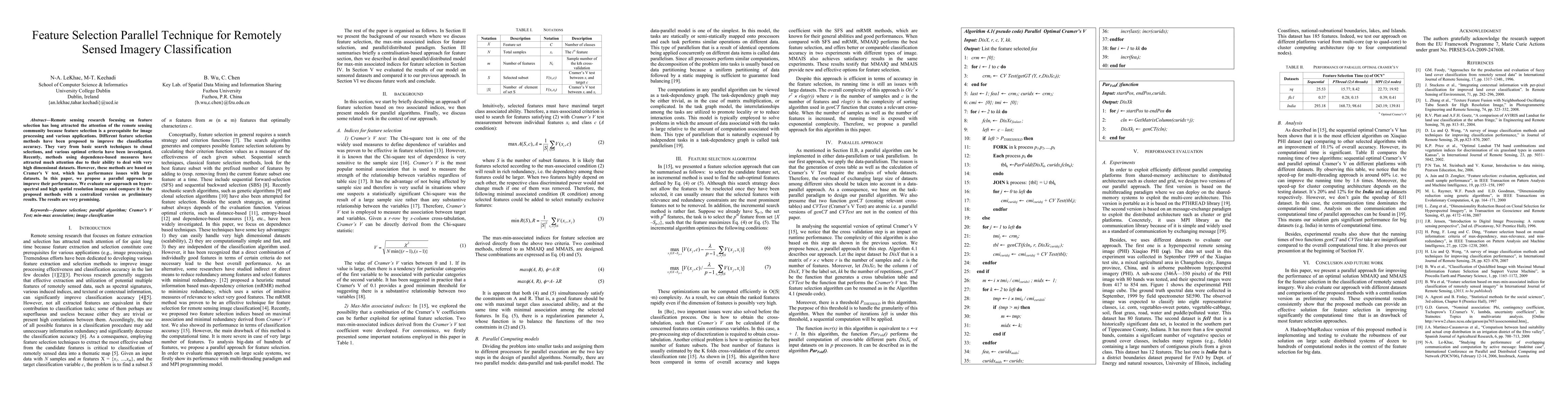 Remote sensing research focusing on feature selection has long attracted the attention of the remote sensing community because feature selection is a prerequisite for image processing and various applications. Different feature selection methods have been proposed to improve the classification accuracy. They vary from basic search techniques to clonal selections, and various optimal criteria have been investigated. Recently, methods using dependence-based measures have attracted much attention due to their ability to deal with very high dimensional datasets. However, these methods are based on Cramers V test, which has performance issues with large datasets. In this paper, we propose a parallel approach to improve their performance. We evaluate our approach on hyper-spectral and high spatial resolution images and compare it to the proposed methods with a centralized version as preliminary results. The results are very promising.