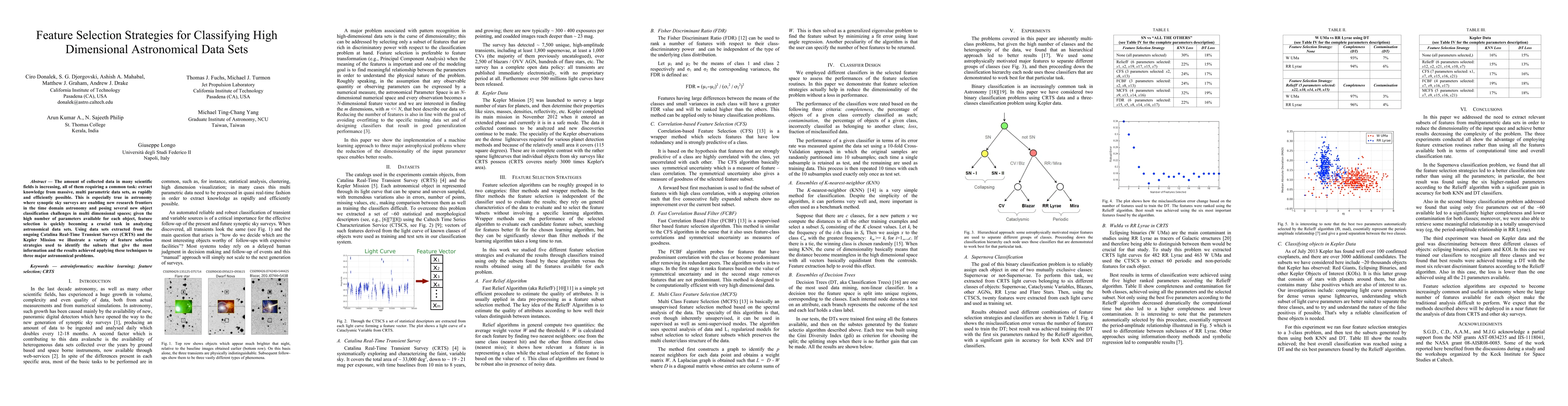 This paper investigates feature selection strategies to efficiently classify high-dimensional astronomical datasets, employing methods on data from the Catalina Real-Time Transient Surveys and the Kepler Mission to solve three major astronomical classification challenges. The study highlights the importance of feature selection in managing the complexity and volume of astronomical data.