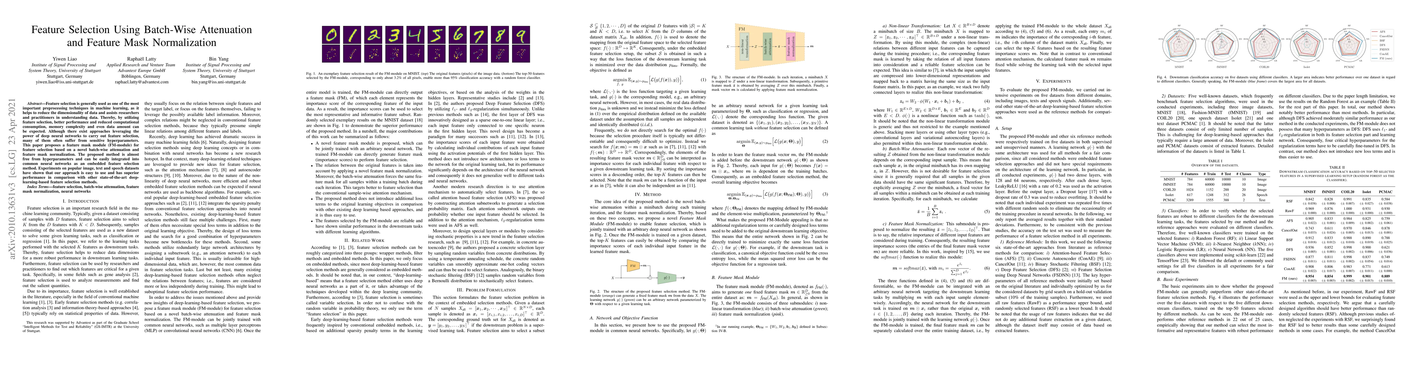 Feature selection is generally used as one of the most important preprocessing techniques in machine learning, as it helps to reduce the dimensionality of data and assists researchers and practitioners in understanding data. Thereby, by utilizing feature selection, better performance and reduced computational consumption, memory complexity and even data amount can be expected. Although there exist approaches leveraging the power of deep neural networks to carry out feature selection, many of them often suffer from sensitive hyperparameters. This paper proposes a feature mask module (FM-module) for feature selection based on a novel batch-wise attenuation and feature mask normalization. The proposed method is almost free from hyperparameters and can be easily integrated into common neural networks as an embedded feature selection method. Experiments on popular image, text and speech datasets have shown that our approach is easy to use and has superior performance in comparison with other state-of-the-art deep-learning-based feature selection methods.