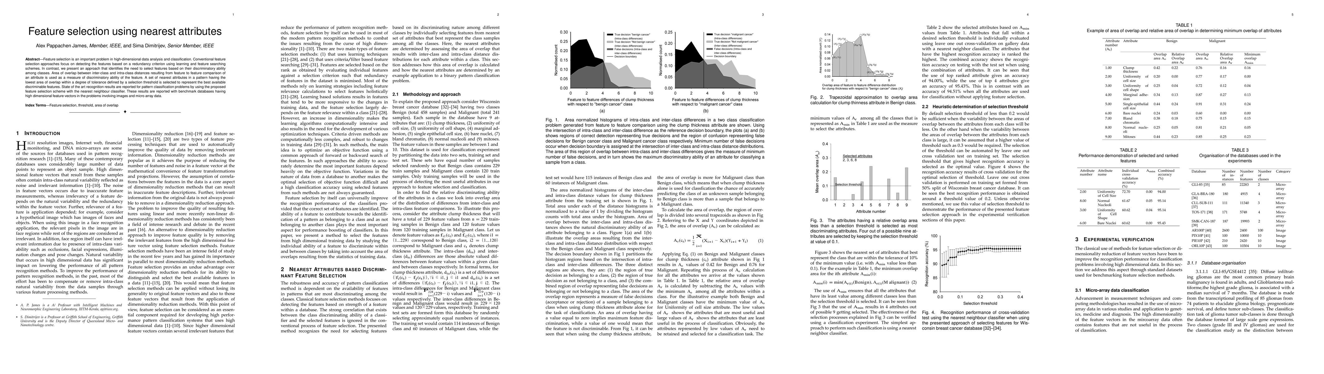 This paper proposes a novel feature selection method that prioritizes features based on their discriminatory ability among classes, using the area of overlap between inter-class and intra-class distances as a measure. The method selects a set of nearest attributes with the lowest overlap within a defined tolerance, achieving state-of-the-art recognition results for pattern classification in image and microarray data.