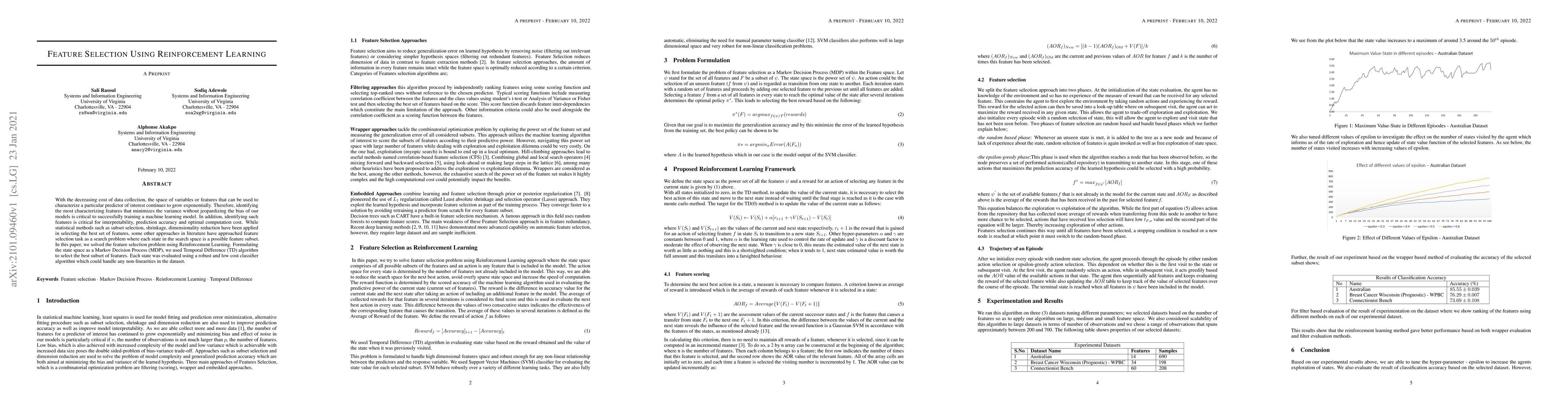 This paper proposes using Reinforcement Learning to tackle the feature selection problem by formulating it as a Markov Decision Process. The Temporal Difference algorithm is employed to identify the optimal subset of features, balancing model accuracy and computational efficiency.