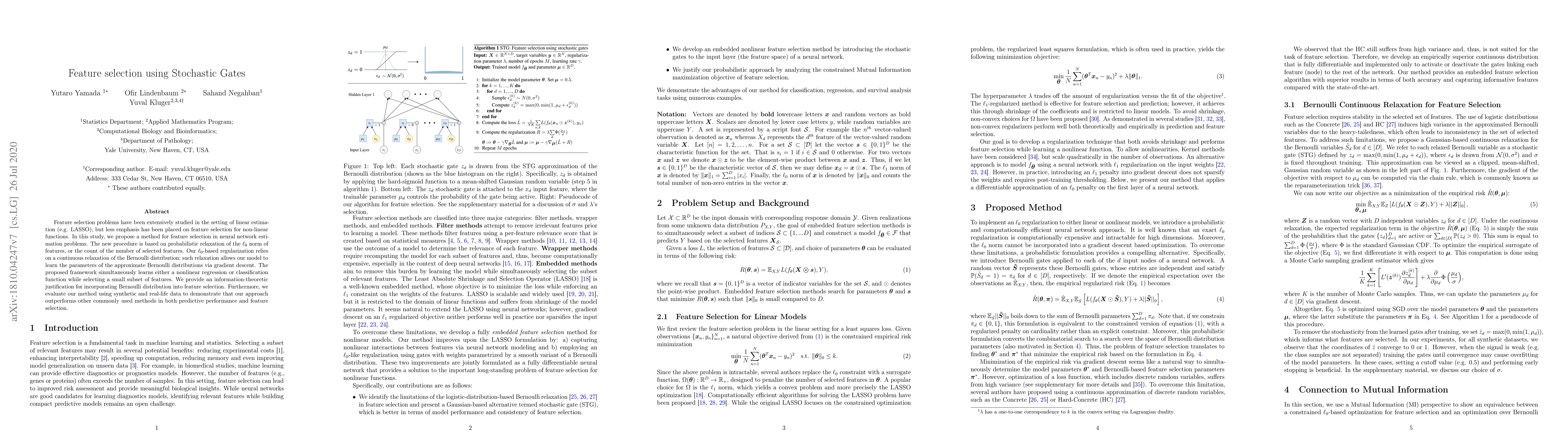 Feature selection problems have been extensively studied for linear estimation, for instance, Lasso, but less emphasis has been placed on feature selection for non-linear functions. In this study, we propose a method for feature selection in high-dimensional non-linear function estimation problems. The new procedure is based on minimizing the $\ell_0$ norm of the vector of indicator variables that represent if a feature is selected or not. Our approach relies on the continuous relaxation of Bernoulli distributions, which allows our model to learn the parameters of the approximate Bernoulli distributions via gradient descent. This general framework simultaneously minimizes a loss function while selecting relevant features. Furthermore, we provide an information-theoretic justification of incorporating Bernoulli distribution into our approach and demonstrate the potential of the approach on synthetic and real-life applications.
