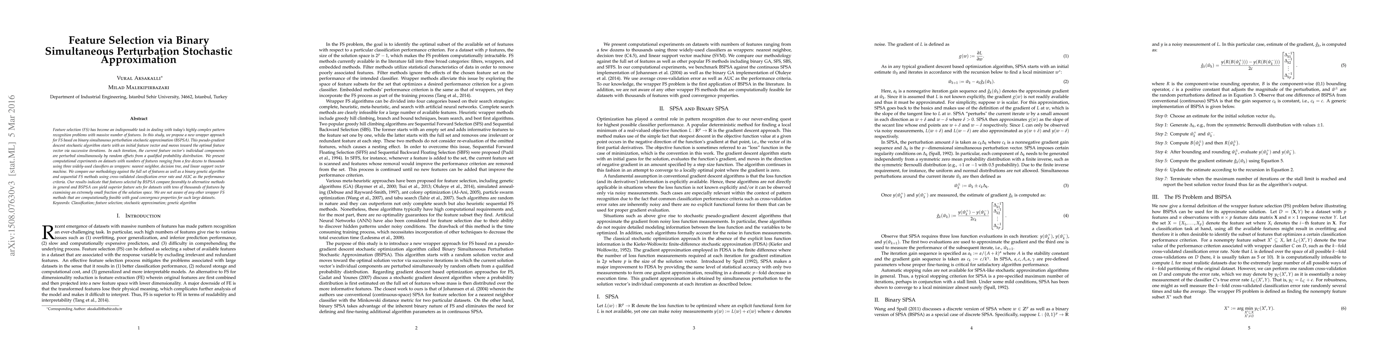 This paper proposes a novel wrapper feature selection method using binary simultaneous perturbation stochastic approximation (BSPSA) to efficiently identify optimal feature subsets for complex pattern recognition problems. Experimental results show that BSPSA outperforms alternative methods, especially for large datasets, by exploring a minimal portion of the solution space.