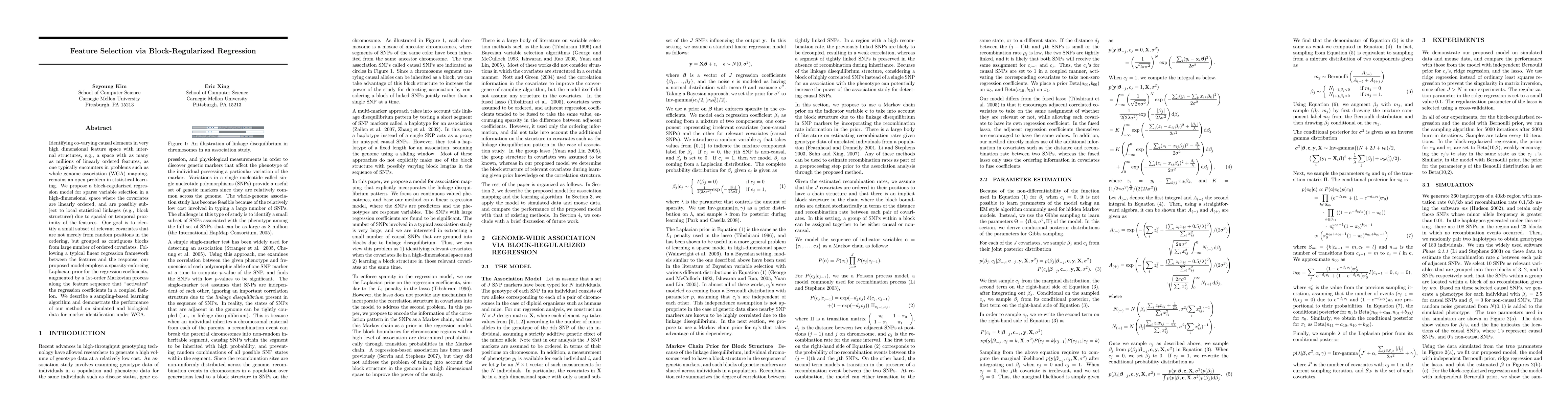 This paper proposes a block-regularized regression model for identifying relevant, contiguous blocks of covariates in high-dimensional, ordered feature spaces, such as in whole genome association studies. The model uses a sparsity-enforcing Laplacian prior and a Markovian process to enforce coupled regression coefficients, and is demonstrated on simulated and biological data.