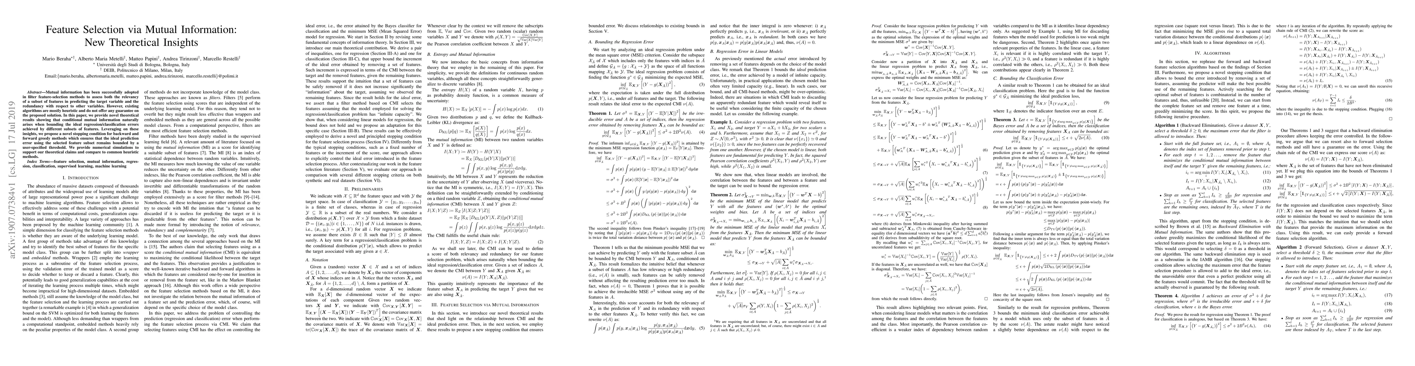 This paper introduces theoretical insights into mutual information for feature selection, demonstrating that conditional mutual information bounds optimal prediction errors. It proposes a new stopping condition for greedy methods to ensure prediction error remains within a specified threshold, supported by numerical simulations.