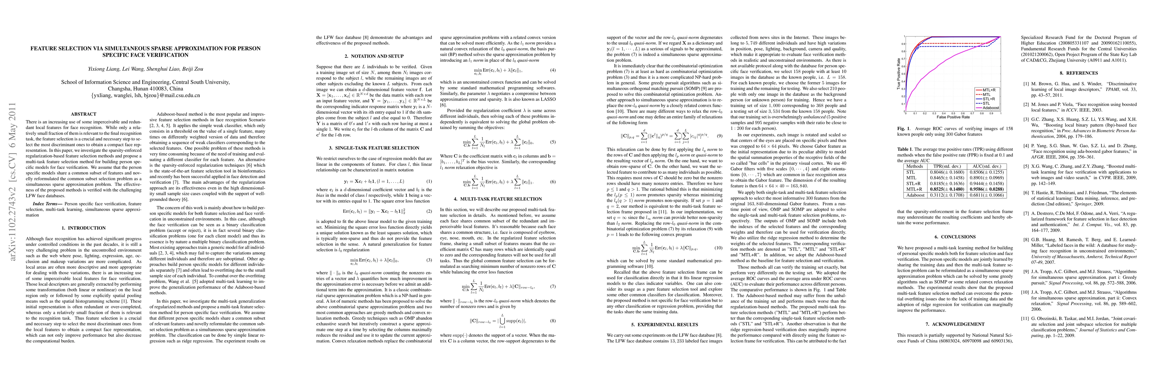 This paper proposes a novel multi-task feature selection method for person-specific face verification, reformulating the common subset selection problem as a simultaneous sparse approximation problem to achieve a compact and effective face representation. The method's effectiveness is demonstrated on the LFW face database.