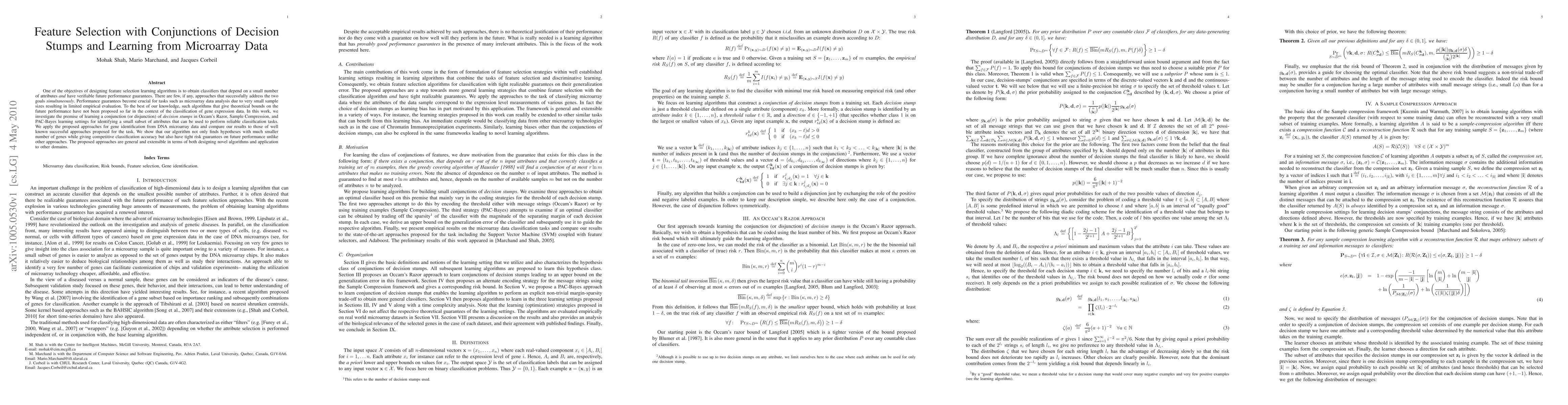 One of the objectives of designing feature selection learning algorithms is to obtain classifiers that depend on a small number of attributes and have verifiable future performance guarantees. There are few, if any, approaches that successfully address the two goals simultaneously. Performance guarantees become crucial for tasks such as microarray data analysis due to very small sample sizes resulting in limited empirical evaluation. To the best of our knowledge, such algorithms that give theoretical bounds on the future performance have not been proposed so far in the context of the classification of gene expression data. In this work, we investigate the premise of learning a conjunction (or disjunction) of decision stumps in Occam's Razor, Sample Compression, and PAC-Bayes learning settings for identifying a small subset of attributes that can be used to perform reliable classification tasks. We apply the proposed approaches for gene identification from DNA microarray data and compare our results to those of well known successful approaches proposed for the task. We show that our algorithm not only finds hypotheses with much smaller number of genes while giving competitive classification accuracy but also have tight risk guarantees on future performance unlike other approaches. The proposed approaches are general and extensible in terms of both designing novel algorithms and application to other domains.