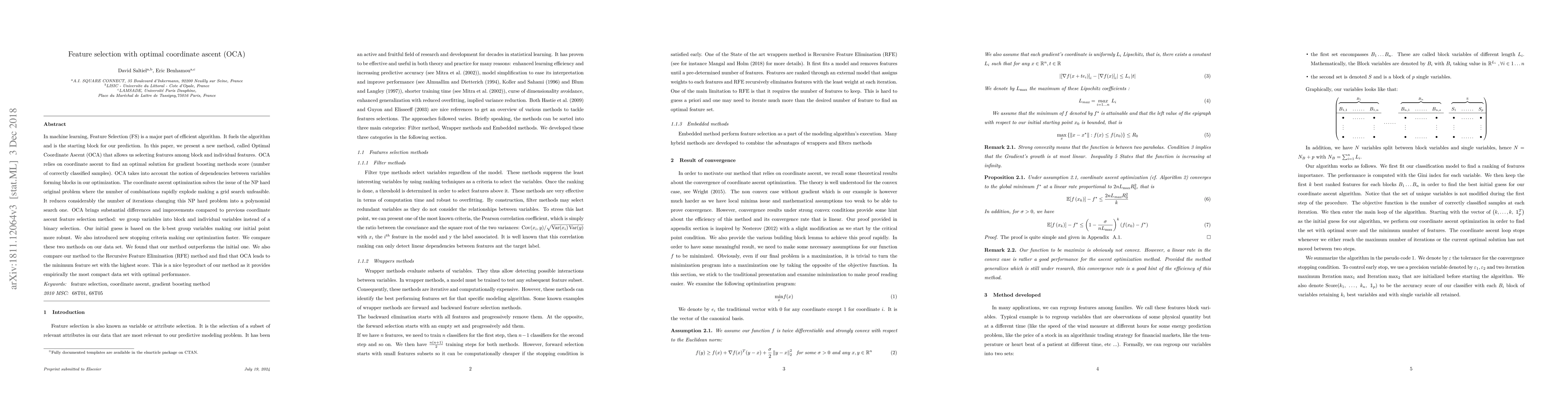 This paper introduces Optimal Coordinate Ascent (OCA), a new feature selection method that groups variables into blocks and uses coordinate ascent optimization to efficiently find the optimal feature set for gradient boosting. OCA significantly reduces computational complexity compared to traditional methods and outperforms previous coordinate ascent and Recursive Feature Elimination (RFE) techniques in terms of both performance and compactness.