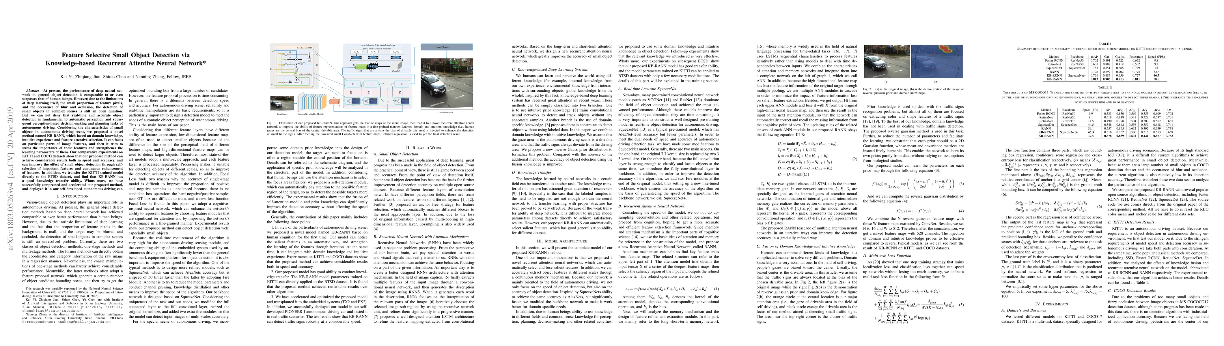 At present, the performance of deep neural network in general object detection is comparable to or even surpasses that of human beings. However, due to the limitations of deep learning itself, the small proportion of feature pixels, and the occurence of blur and occlusion, the detection of small objects in complex scenes is still an open question. But we can not deny that real-time and accurate object detection is fundamental to automatic perception and subsequent perception-based decision-making and planning tasks of autonomous driving. Considering the characteristics of small objects in autonomous driving scene, we proposed a novel method named KB-RANN, which based on domain knowledge, intuitive experience and feature attentive selection. It can focus on particular parts of image features, and then it tries to stress the importance of these features and strengthenes the learning parameters of them. Our comparative experiments on KITTI and COCO datasets show that our proposed method can achieve considerable results both in speed and accuracy, and can improve the effect of small object detection through self-selection of important features and continuous enhancement of proposed method, and deployed it in our self-developed autonomous driving car.