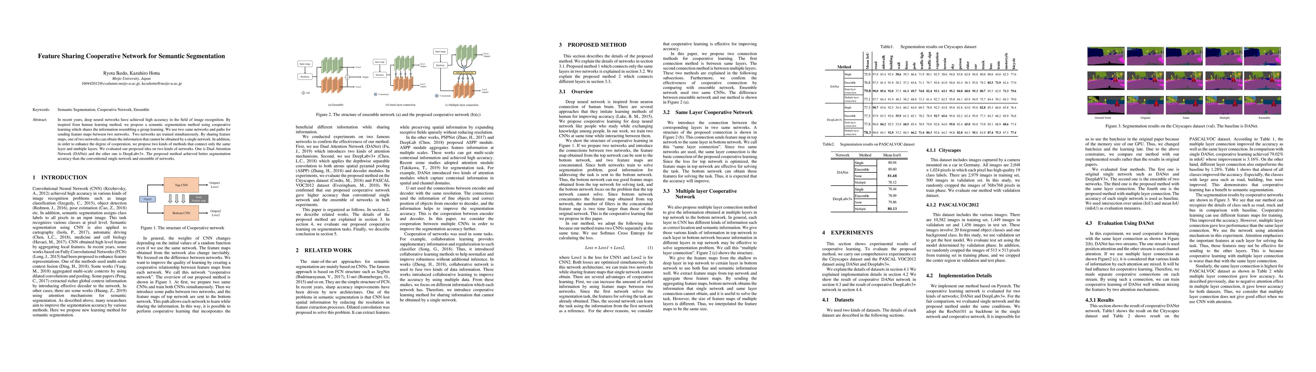 In recent years, deep neural networks have achieved high ac-curacy in the field of image recognition. By inspired from human learning method, we propose a semantic segmentation method using cooperative learning which shares the information resembling a group learning. We use two same networks and paths for sending feature maps between two networks. Two networks are trained simultaneously. By sharing feature maps, one of two networks can obtain the information that cannot be obtained by a single network. In addition, in order to enhance the degree of cooperation, we propose two kinds of methods that connect only the same layer and multiple layers. We evaluated our proposed idea on two kinds of networks. One is Dual Attention Network (DANet) and the other one is DeepLabv3+. The proposed method achieved better segmentation accuracy than the conventional single network and ensemble of networks.