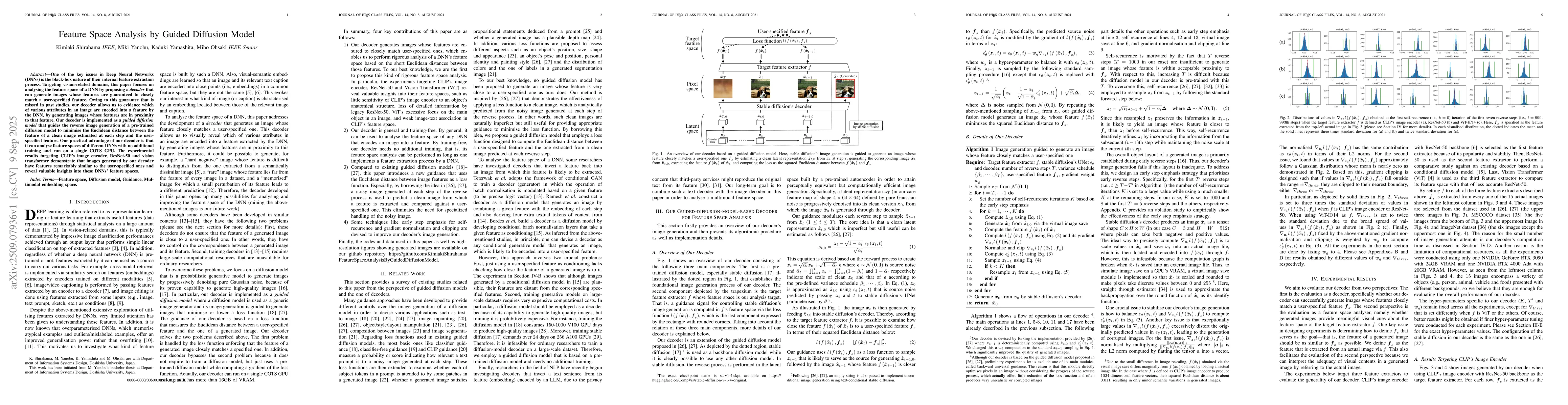 One of the key issues in Deep Neural Networks (DNNs) is the black-box nature of their internal feature extraction process. Targeting vision-related domains, this paper focuses on analysing the feature space of a DNN by proposing a decoder that can generate images whose features are guaranteed to closely match a user-specified feature. Owing to this guarantee that is missed in past studies, our decoder allows us to evidence which of various attributes in an image are encoded into a feature by the DNN, by generating images whose features are in proximity to that feature. Our decoder is implemented as a guided diffusion model that guides the reverse image generation of a pre-trained diffusion model to minimise the Euclidean distance between the feature of a clean image estimated at each step and the user-specified feature. One practical advantage of our decoder is that it can analyse feature spaces of different DNNs with no additional training and run on a single COTS GPU. The experimental results targeting CLIP's image encoder, ResNet-50 and vision transformer demonstrate that images generated by our decoder have features remarkably similar to the user-specified ones and reveal valuable insights into these DNNs' feature spaces.