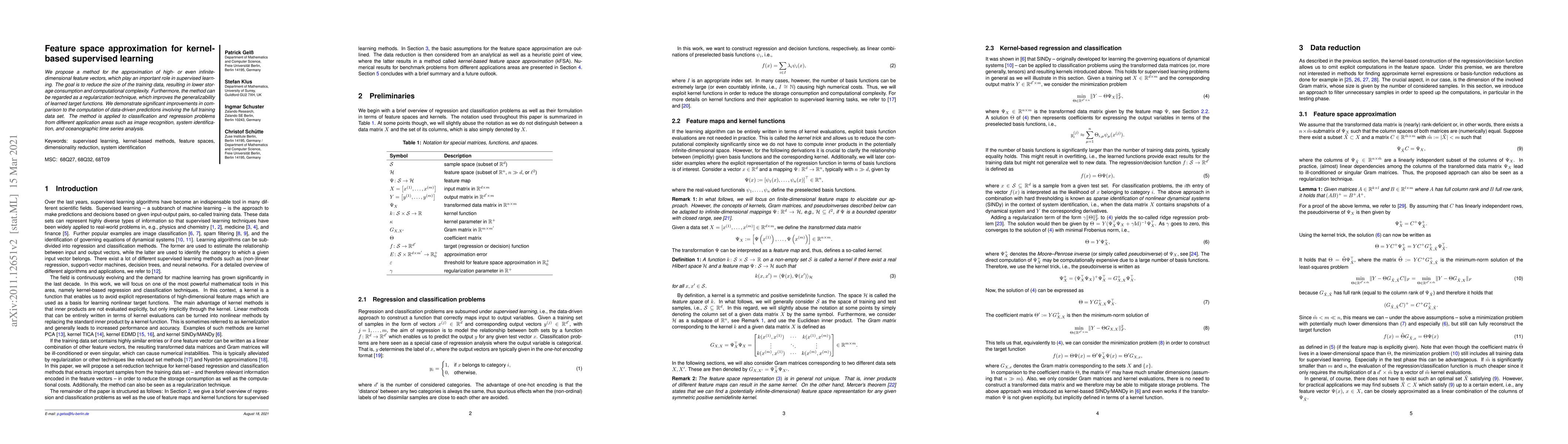 We propose a method for the approximation of high- or even infinite-dimensional feature vectors, which play an important role in supervised learning. The goal is to reduce the size of the training data, resulting in lower storage consumption and computational complexity. Furthermore, the method can be regarded as a regularization technique, which improves the generalizability of learned target functions. We demonstrate significant improvements in comparison to the computation of data-driven predictions involving the full training data set. The method is applied to classification and regression problems from different application areas such as image recognition, system identification, and oceanographic time series analysis.