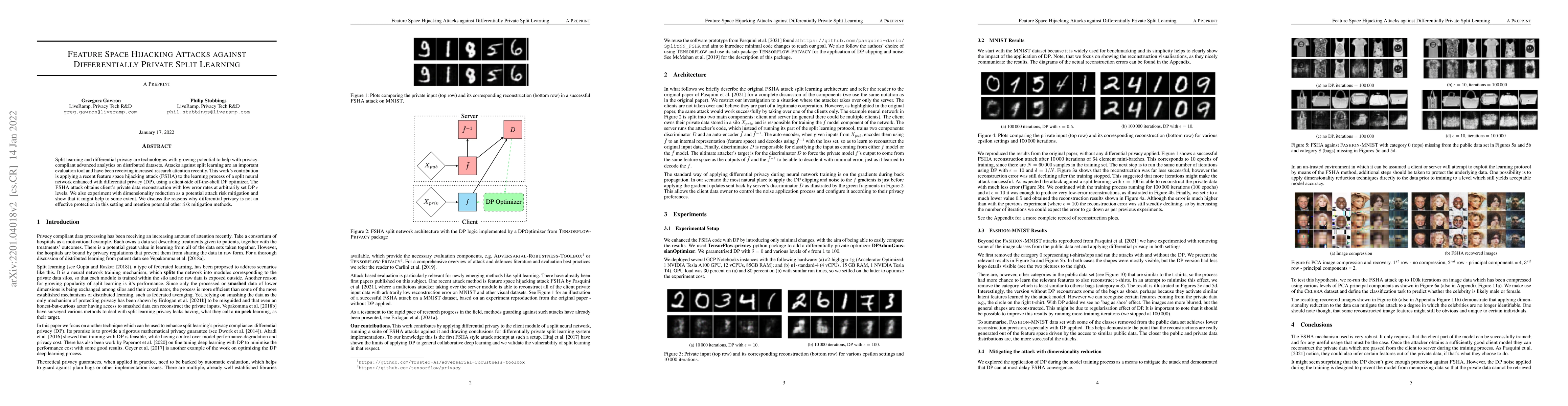 Researchers discovered a vulnerability in split learning with differential privacy, known as feature space hijacking attacks, which can reconstruct private data with low error rates at any level of privacy epsilon. They also explored dimensionality reduction as a potential mitigation method but found it partially effective.