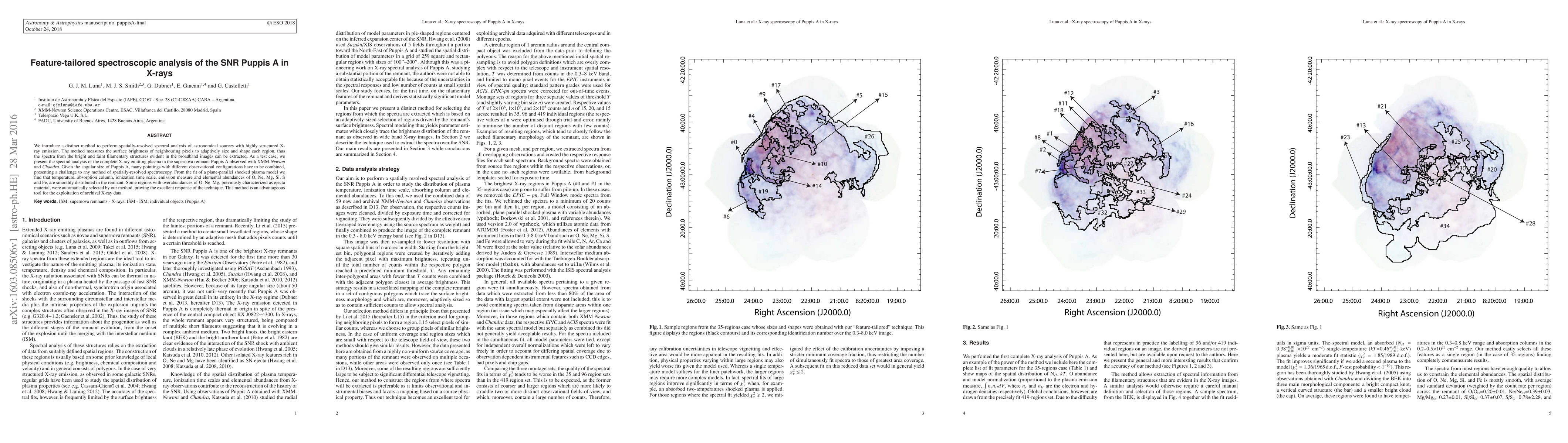We introduce a distinct method to perform spatially-resolved spectral analysis of astronomical sources with highly structured X-ray emission. The method measures the surface brightness of neighbouring pixels to adaptively size and shape each region, thus the spectra from the bright and faint filamentary structures evident in the broadband images can be extracted. As a test case, we present the spectral analysis of the complete X-ray emitting plasma in the supernova remnant Puppis A observed with XMM-Newton and Chandra. Given the angular size of Puppis A, many pointings with different observational configurations have to be combined, presenting a challenge to any method of spatially-resolved spectroscopy. From the fit of a plane-parallel shocked plasma model we find that temperature, absorption column, ionization time scale, emission measure and elemental abundances of O, Ne, Mg, Si, S and Fe, are smoothly distributed in the remnant. Some regions with overabundances of O-Ne-Mg, previously characterized as ejecta material, were automatically selected by our method, proving the excellent response of the technique. This method is an advantageous tool for the exploitation of archival X-ray data.