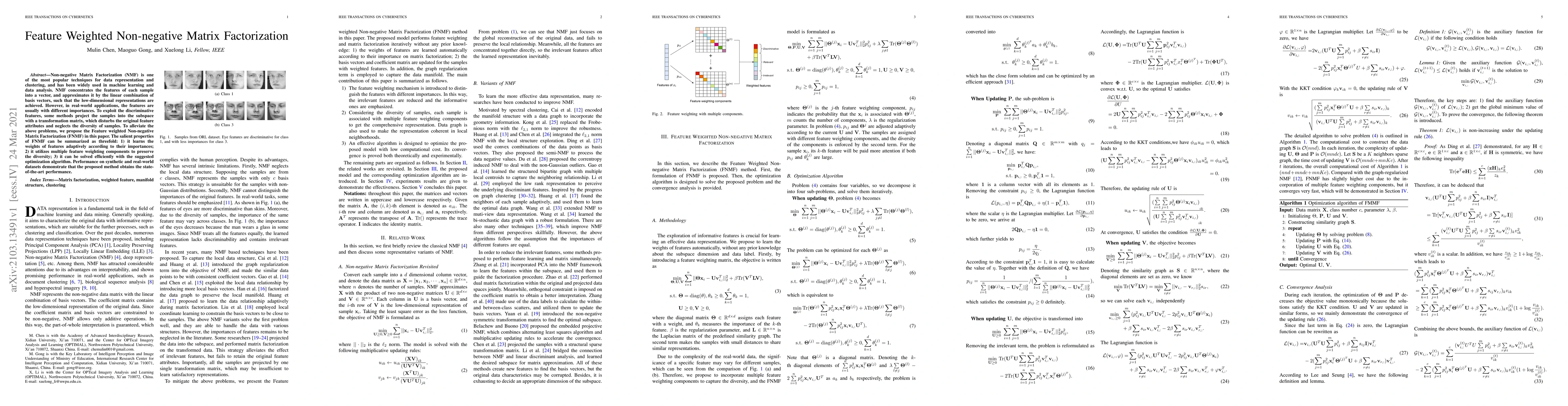 The paper proposes Feature Weighted Non-negative Matrix Factorization (FNMF) to adaptively learn feature importances, preserve sample diversity, and achieve efficient optimization, outperforming existing methods on both synthetic and real-world datasets.