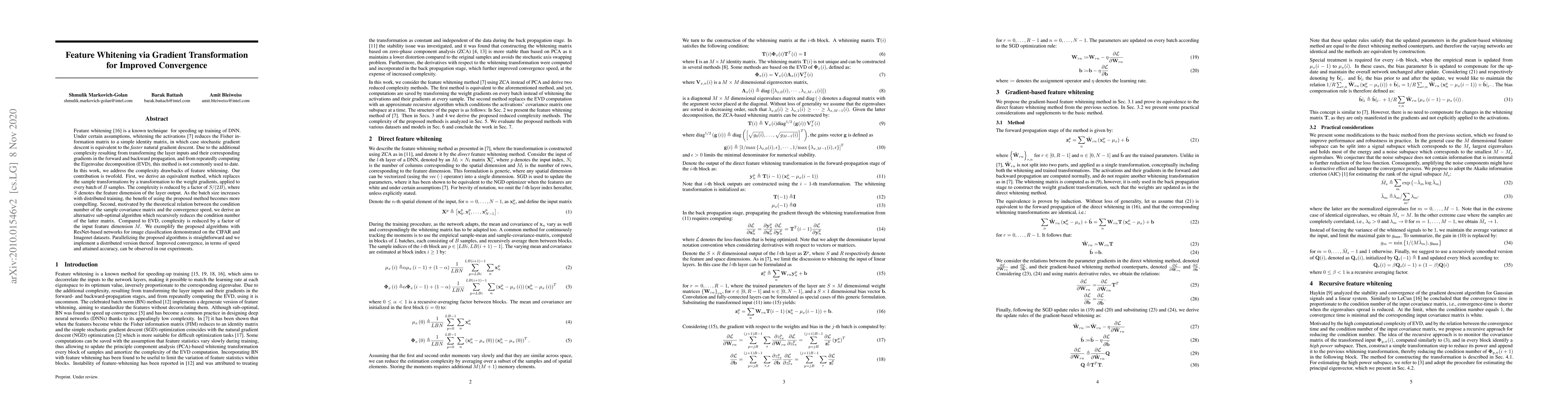 Feature whitening is a known technique for speeding up training of DNN. Under certain assumptions, whitening the activations reduces the Fisher information matrix to a simple identity matrix, in which case stochastic gradient descent is equivalent to the faster natural gradient descent. Due to the additional complexity resulting from transforming the layer inputs and their corresponding gradients in the forward and backward propagation, and from repeatedly computing the Eigenvalue decomposition (EVD), this method is not commonly used to date. In this work, we address the complexity drawbacks of feature whitening. Our contribution is twofold. First, we derive an equivalent method, which replaces the sample transformations by a transformation to the weight gradients, applied to every batch of B samples. The complexity is reduced by a factor of S=(2B), where S denotes the feature dimension of the layer output. As the batch size increases with distributed training, the benefit of using the proposed method becomes more compelling. Second, motivated by the theoretical relation between the condition number of the sample covariance matrix and the convergence speed, we derive an alternative sub-optimal algorithm which recursively reduces the condition number of the latter matrix. Compared to EVD, complexity is reduced by a factor of the input feature dimension M. We exemplify the proposed algorithms with ResNet-based networks for image classification demonstrated on the CIFAR and Imagenet datasets. Parallelizing the proposed algorithms is straightforward and we implement a distributed version thereof. Improved convergence, in terms of speed and attained accuracy, can be observed in our experiments.