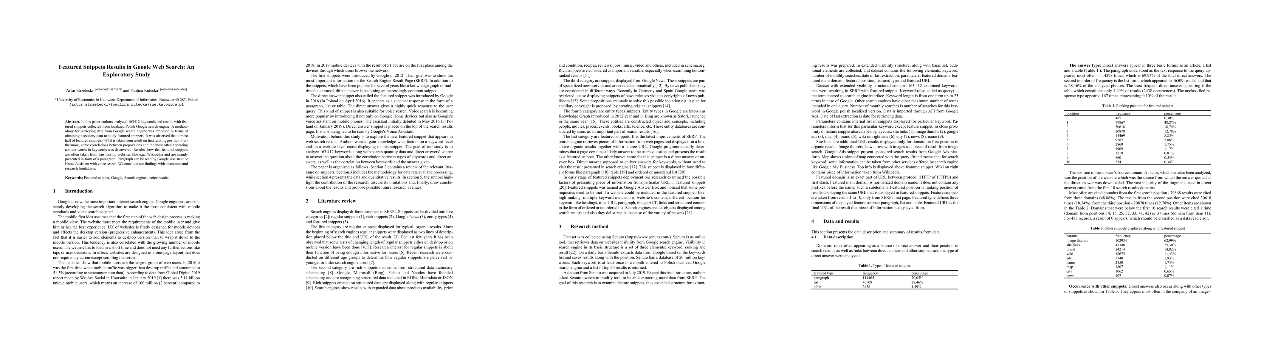 This study analyzed 163,412 keywords and featured snippets from the Polish Google search engine to explore the sources and characteristics of featured snippets. It found that 48% of featured snippets come from the top-ranking result, often from trusted sites like Wikipedia, and are typically presented as paragraphs suitable for voice search.