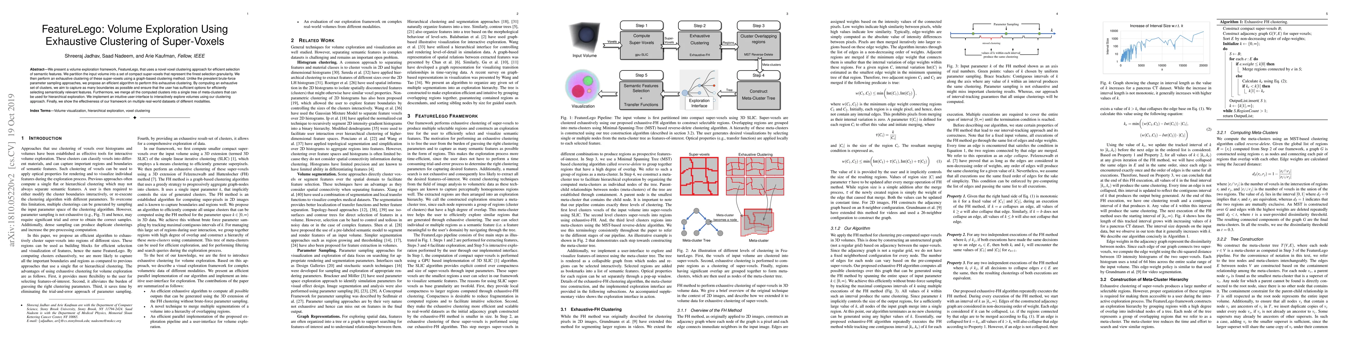 We present a volume exploration framework, FeatureLego, that uses a novel voxel clustering approach for efficient selection of semantic features. We partition the input volume into a set of compact super-voxels that represent the finest selection granularity. We then perform an exhaustive clustering of these super-voxels using a graph-based clustering method. Unlike the prevalent brute-force parameter sampling approaches, we propose an efficient algorithm to perform this exhaustive clustering. By computing an exhaustive set of clusters, we aim to capture as many boundaries as possible and ensure that the user has sufficient options for efficiently selecting semantically relevant features. Furthermore, we merge all the computed clusters into a single tree of meta-clusters that can be used for hierarchical exploration. We implement an intuitive user-interface to interactively explore volumes using our clustering approach. Finally, we show the effectiveness of our framework on multiple real-world datasets of different modalities.