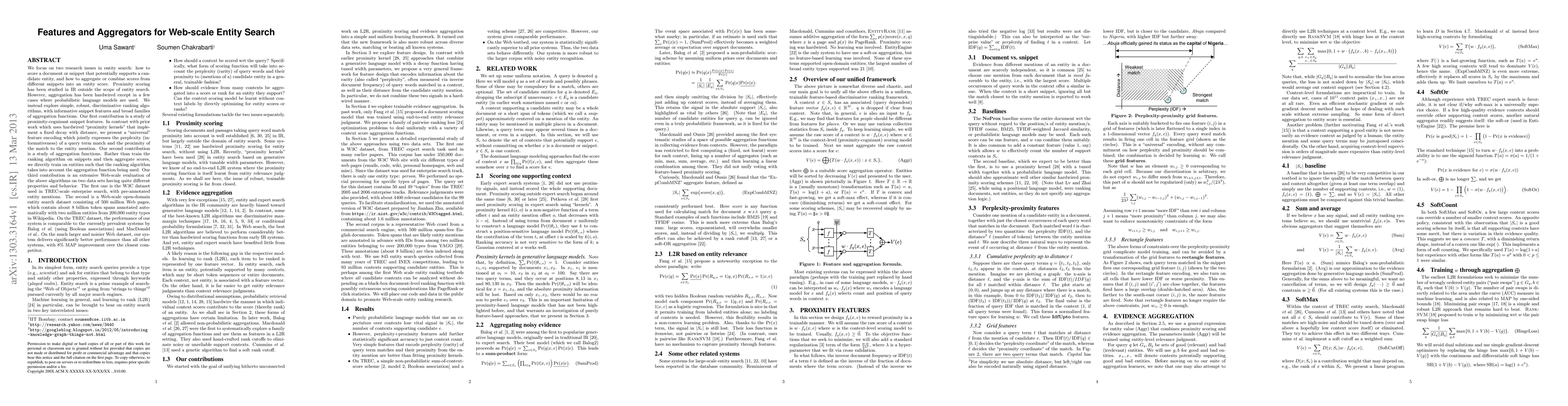 This paper proposes novel methods for web-scale entity search, focusing on snippet features that consider both perplexity and proximity, and aggregation functions trained directly on entities. The proposed algorithms significantly outperform existing systems on a large, noisy web dataset.