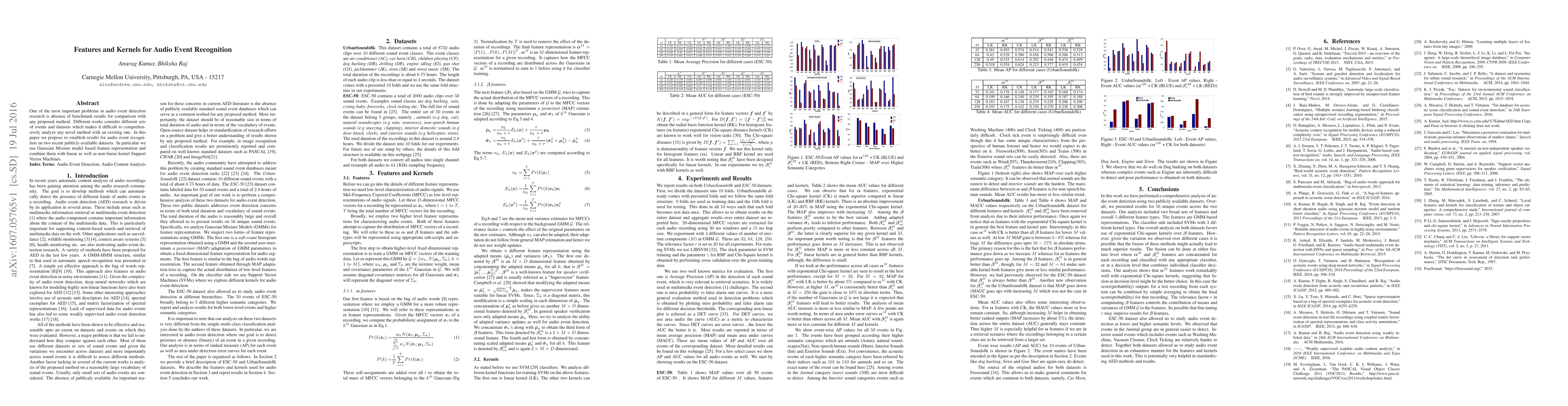 Researchers developed a new method for audio event recognition using Gaussian Mixture models and Support Vector Machines with linear and non-linear kernels, testing it on two publicly available datasets to establish benchmark results.