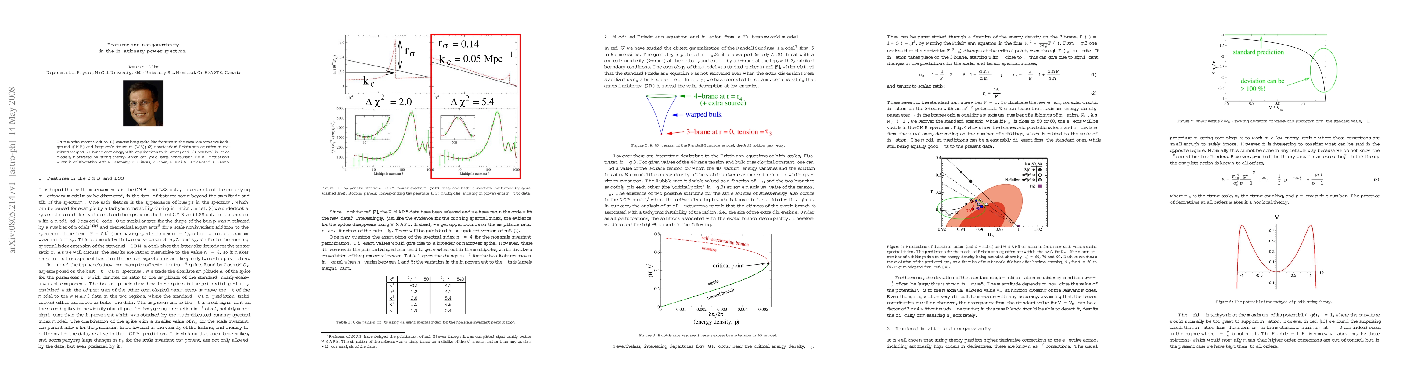 I summarize recent work on (1) constraining spike-like features in the cosmic microwave background and large scale structure; (2) nonstandard Friedmann equation in stabilized warped 6D brane cosmology, with applications to inflation; and (3) nonlocal inflation models, motivated by string theory, which can yield large nongaussian CMB fluctuations. Work in collaboration with N. Barnaby, T. Biswas, F. Chen, L. Hoi, G. Holder and S. Kanno.