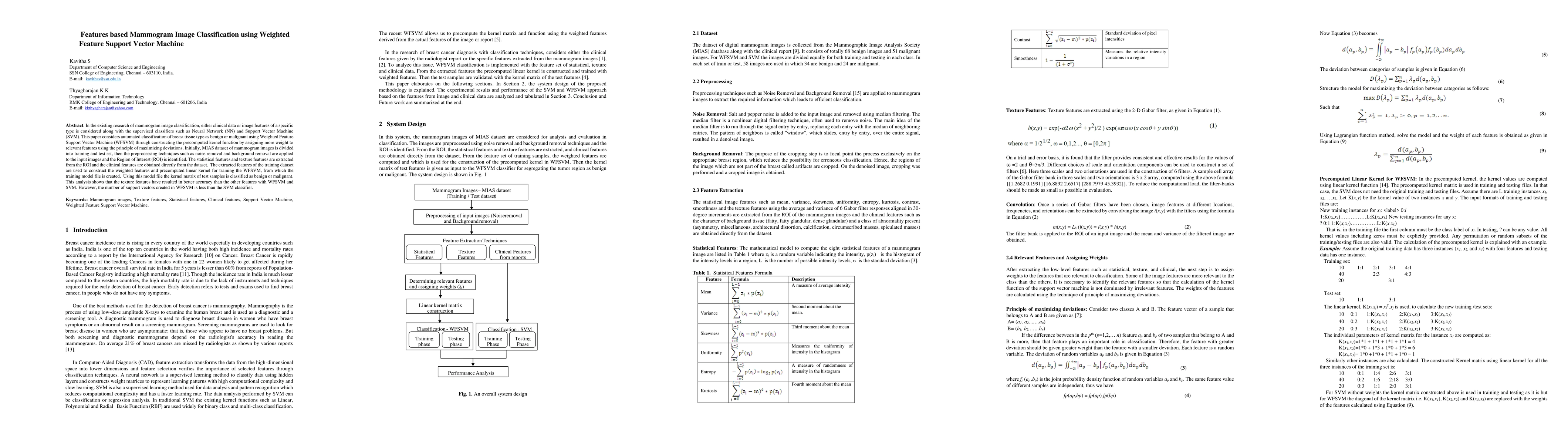 The paper proposes a method for automated classification of breast tissue in mammogram images using Weighted Feature Support Vector Machine (WFSVM). It involves preprocessing techniques, feature extraction (statistical, texture, and clinical), assigning weights to relevant features using the principle of maximizing deviations, and constructing a precomputed linear kernel for WFSVM training.