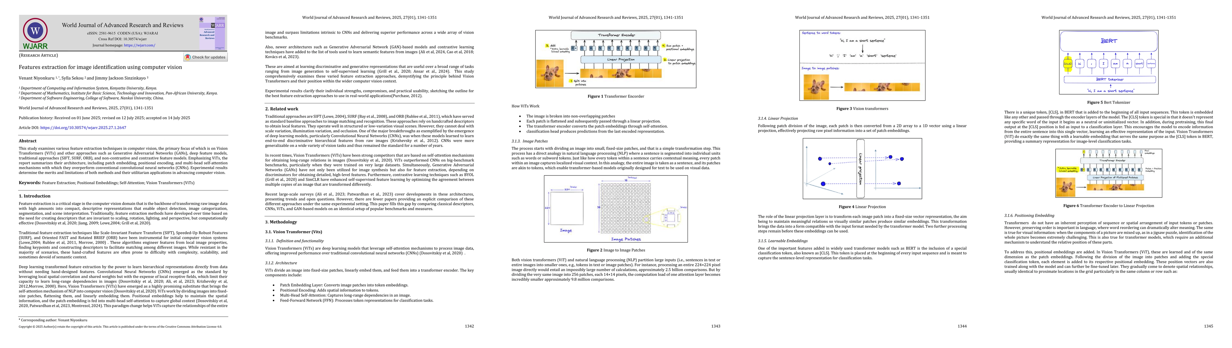 This study examines various feature extraction techniques in computer vision, the primary focus of which is on Vision Transformers (ViTs) and other approaches such as Generative Adversarial Networks (GANs), deep feature models, traditional approaches (SIFT, SURF, ORB), and non-contrastive and contrastive feature models. Emphasizing ViTs, the report summarizes their architecture, including patch embedding, positional encoding, and multi-head self-attention mechanisms with which they overperform conventional convolutional neural networks (CNNs). Experimental results determine the merits and limitations of both methods and their utilitarian applications in advancing computer vision.