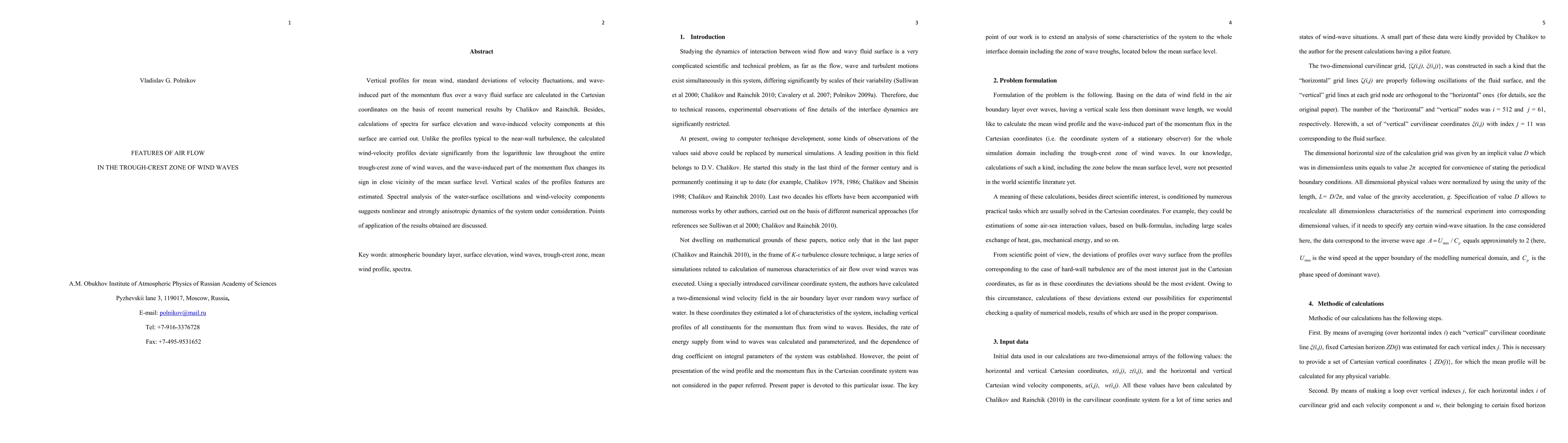 Vertical profiles for mean wind, standard deviations of velocity fluctuations, and wave-induced part of the momentum flux over a wavy fluid surface are calculated in the Cartesian coordinates on the basis of recent numerical results by Chalikov and Rainchik. Besides, calculations of spectra for surface elevation and wave-induced velocity components at this surface are carried out. Unlike the profiles typical to the near-wall turbulence, the calculated wind-velocity profiles deviate significantly from the logarithmic law throughout the entire trough-crest zone of wind waves, and the wave-induced part of the momentum flux changes its sign in close vicinity of the mean surface level. Vertical scales of the profiles features are estimated. Spectral analysis of the water-surface oscillations and wind-velocity components suggests nonlinear and strongly anisotropic dynamics of the system under consideration. Points of application of the results obtained are discussed.