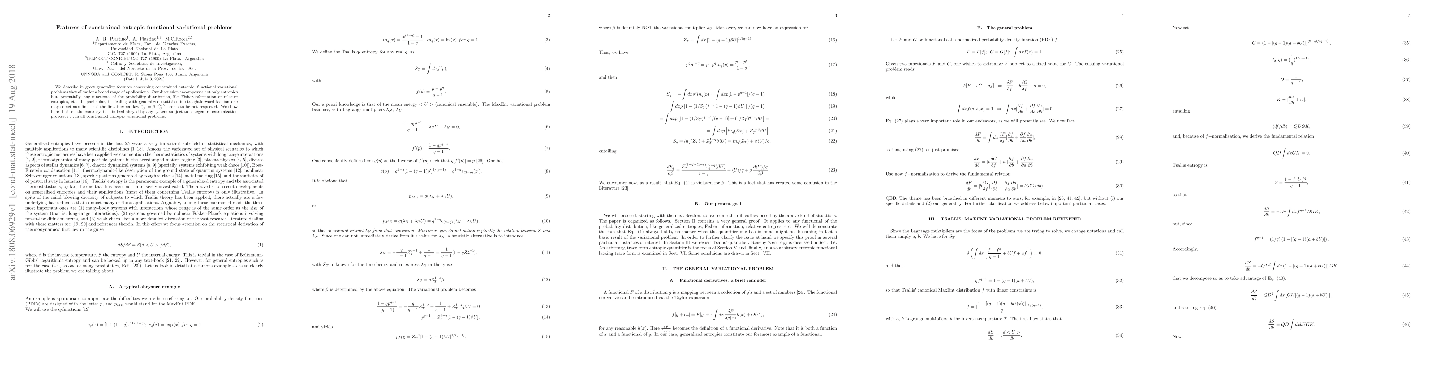 We describe in great generality features concerning constrained entropic, functional variational problems that allow for a broad range of applications. Our discussion encompasses not only entropies but, potentially, any functional of the probability distribution, like Fisher-information or relative entropies, etc. In particular, in dealing with generalized statistics in straightforward fashion one may sometimes find that the first thermal law $\frac{dS}{d\beta}=\beta\frac{d}{d\beta}$ seems to be not respected. We show here that, on the contrary, it is indeed obeyed by any system subject to a Legendre extremization process, i.e., in all constrained entropic variational problems.