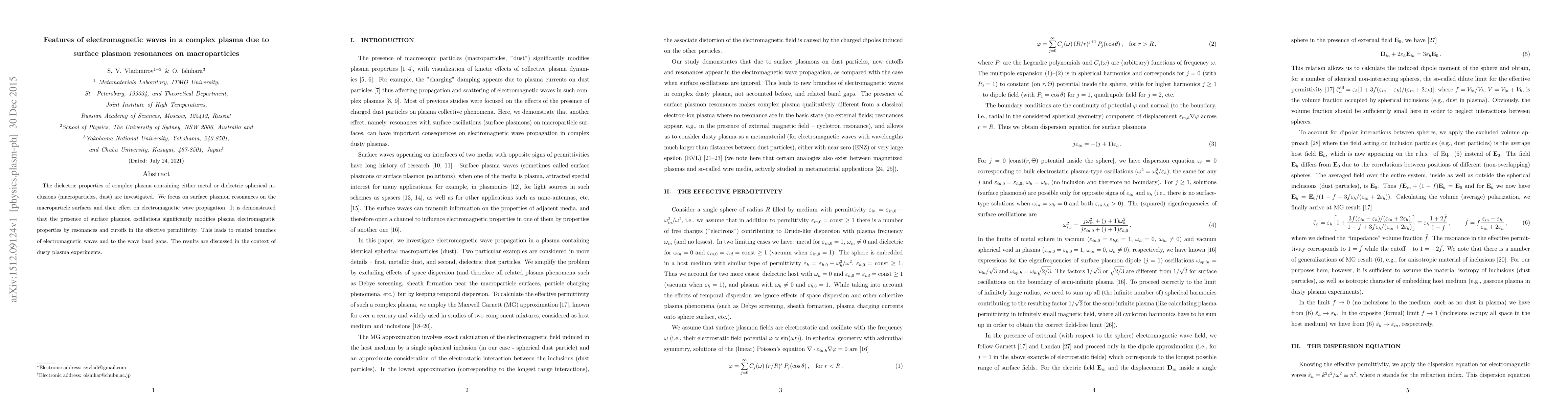 This paper investigates how surface plasmon resonances on metal or dielectric macroparticles in complex plasmas affect electromagnetic wave propagation, revealing modifications in plasma properties and the creation of wave band gaps. The findings are relevant for understanding dusty plasma experiments.