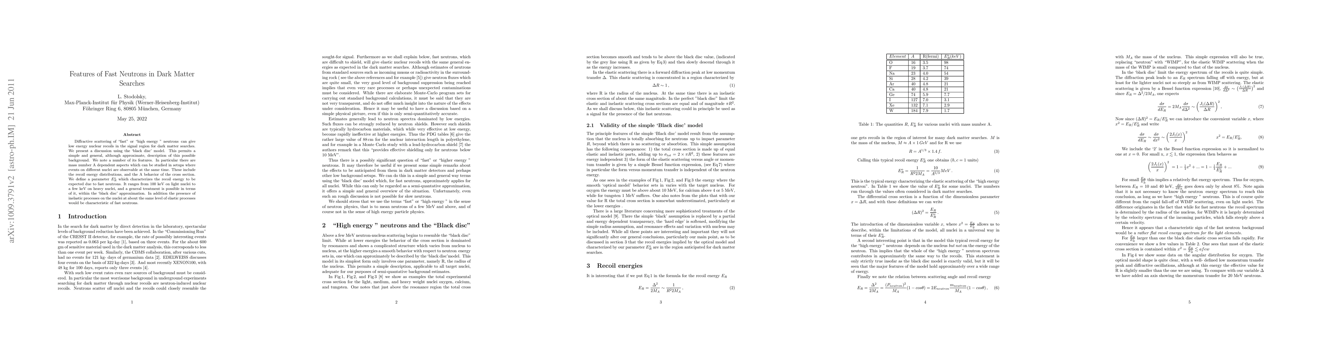 Diffractive scattering of "fast" or "high energy" neutrons, can give low energy nuclear recoils in the signal region for dark matter searches. We present a discussion using the 'black disc' model. This permits a simple and general, although approximate, description of this possible background. We note a number of its features. In particular there are mass number A dependent aspects which can be studied in setups where events on different nuclei are observable at the same time. These include the recoil energy distributions, and the A behavior of the cross section. We define a parameter $E^o_R$ which characterizes the recoil energy to be expected due to fast neutrons. It ranges from 100 keV on light nuclei to a few keV on heavy nuclei, and a general treatment is possible in terms of it, within the 'black disc' approximation. In addition, the presence of inelastic processes would be characteristic of fast neutrons.