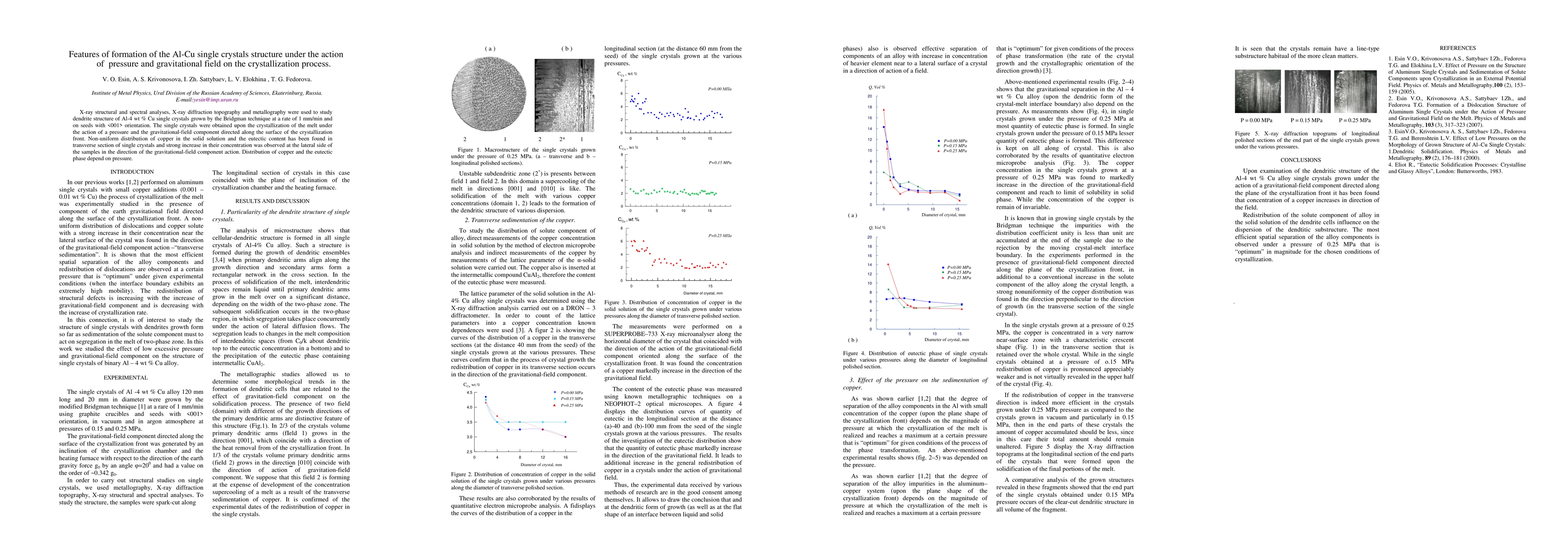 X-ray structural and spectral analyses, X-ray diffraction topography and metallography were used to study dendrite structure of Al-4 wt % Cu single crystals grown by the Bridgman technique at a rate of 1 mm/min and on seeds with <001> orientation. The single crystals were obtained upon the crystallization of the melt under the action of a pressure and the gravitational-field component directed along the surface of the crystallization front. Non-uniform distribution of copper in the solid solution and the eutectic content has been found in transverse section of single crystals and strong increase in their concentration was observed at the lateral side of the samples in the direction of the gravitational-field component action. Distribution of copper and the eutectic phase depend on pressure.