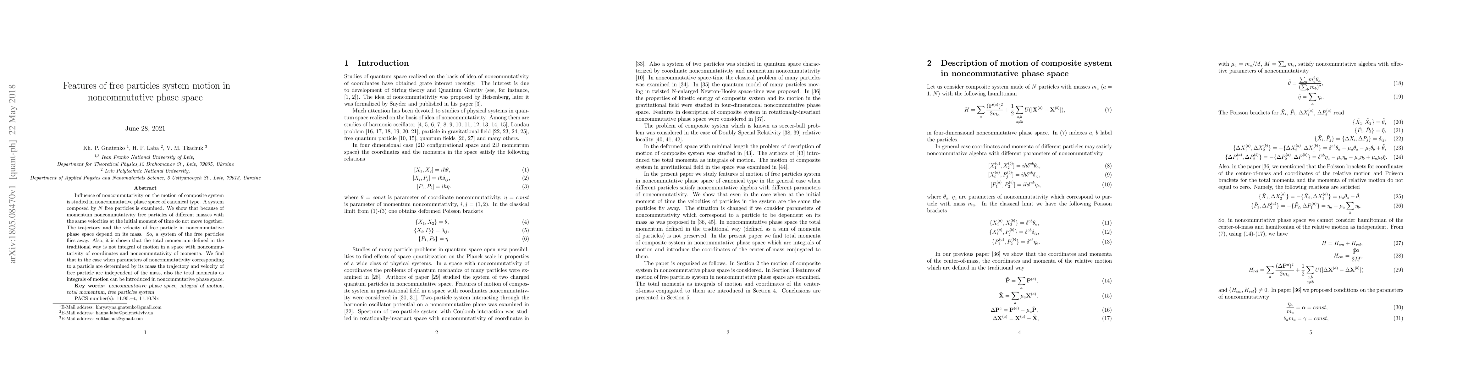 Influence of noncommutativity on the motion of composite system is studied in noncommutative phase space of canonical type. A system composed by $N$ free particles is examined. We show that because of momentum noncommutativity free particles of different masses with the same velocities at the initial moment of time do not move together. The trajectory and the velocity of free particle in noncommutative phase space depend on its mass. So, a system of the free particles flies away. Also, it is shown that the total momentum defined in the traditional way is not integral of motion in a space with noncommutativity of coordinates and noncommutativity of momenta. We find that in the case when parameters of noncommutativity corresponding to a particle are determined by its mass the trajectory and velocity of free particle are independent of the mass, also the total momenta as integrals of motion can be introduced in noncommutative phase space.