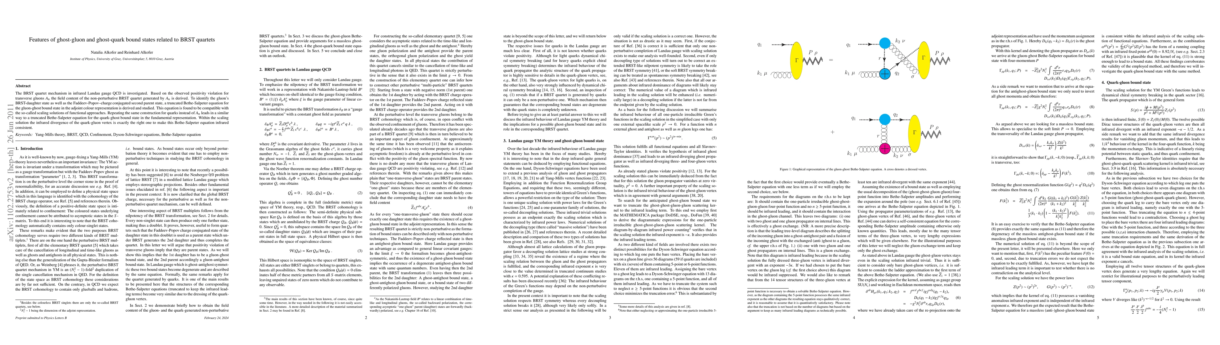 The BRST quartet mechanism in infrared Landau gauge QCD is investigated. Based on the observed positivity violation for transverse gluons $A_{\mathrm {tr}}$ the field content of the non-perturbative BRST quartet generated by $A_{\mathrm {tr}}$ is derived. To identify the gluon's BRST-daughter state as well as the Faddeev-Popov--charge conjugated second parent state, a truncated Bethe-Salpeter equation for the gluon-ghost bound state in the adjoint colour representation is derived and studied. This equation is found to be compatible with the so-called scaling solutions of functional approaches. Repeating the same construction for quarks instead of $A_{\mathrm {tr}}$ leads in a similar way to a truncated Bethe-Salpeter equation for the quark-ghost bound state in the fundamental representation. Within the scaling solution the infrared divergence of the quark-gluon vertex is exactly the right one to make this Bethe-Salpeter equation infrared consistent.