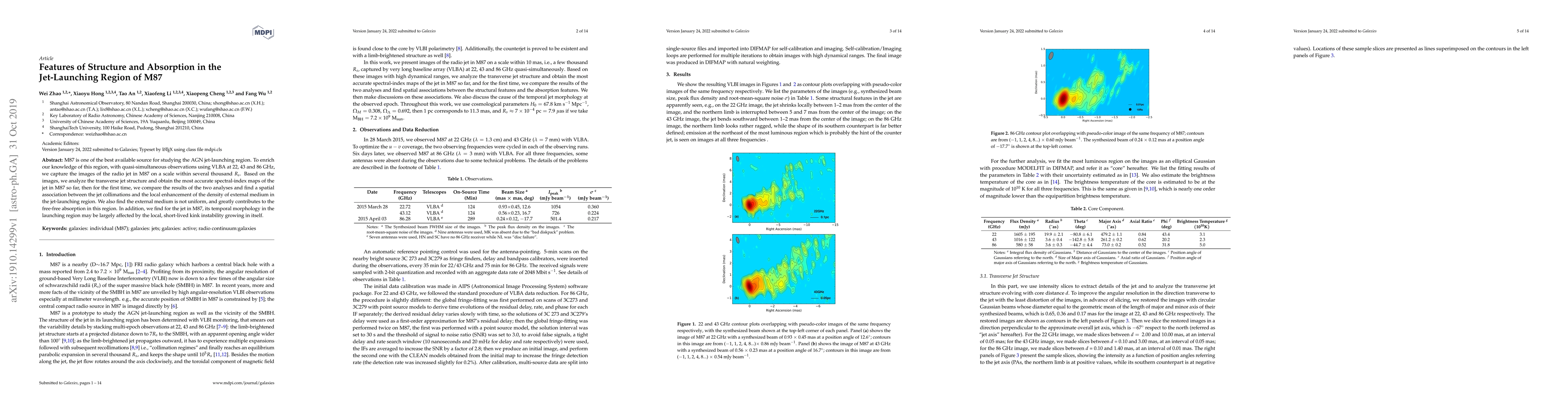 M87 is one of the best available source for studying the AGN jet-launching region. To enrich our knowledge of this region, with quasi-simultaneous observations using VLBA at 22, 43 and 86 GHz, we capture the images of the radio jet in M87 on a scale within several thousand R s . Based on the images, we analyze the transverse jet structure and obtain the most accurate spectral-index maps of the jet in M87 so far, then for the first time, we compare the results of the two analyses and find a spatial association between the jet collimations and the local enhancement of the density of external medium in the jet-launching region. We also find the external medium is not uniform, and greatly contributes to the free-free absorption in this region. In addition, we find for the jet in M87, its temporal morphology in the launching region may be largely affected by the local, short-lived kink instability growing in itself.