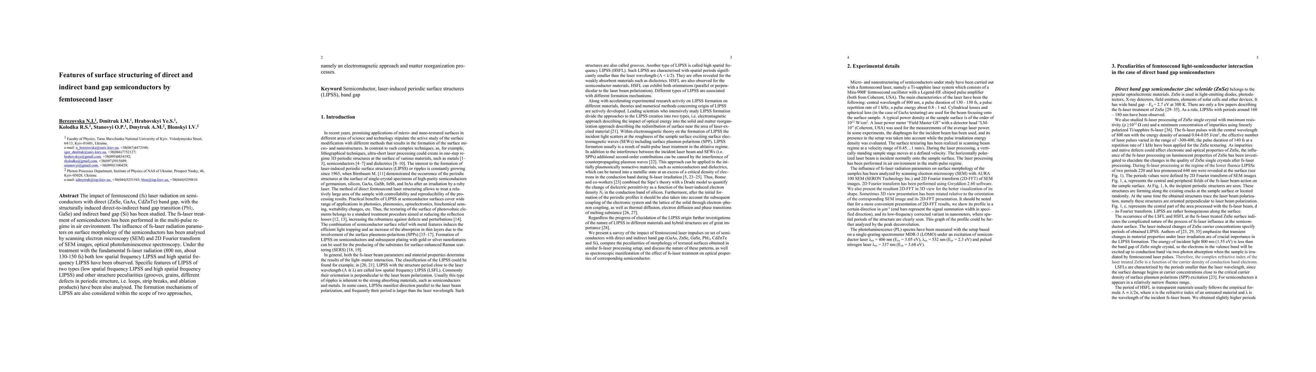 The impact of femtosecond (fs) laser radiation on semiconductors with direct (ZnSe, GaAs, CdZnTe) band gap, with the structurally induced direct-to-indirect band gap transition (PbI2, GaSe) and indirect band gap (Si) has been studied. The fs-laser treatment of semiconductors has been performed in the multi-pulse regime in air environment. The influence of fs-laser radiation parameters on surface morphology of the semiconductors has been analysed by scanning electron microscopy (SEM) and 2D Fourier transform of SEM images, optical photoluminescence spectroscopy. Under the treatment with the fundamental fs-laser radiation (800 nm, about 130-150 fs) both low spatial frequency LIPSS and high spatial frequency LIPSS have been observed. Specific features of LIPSS of two types (low spatial frequency LIPSS and high spatial frequency LIPSS) and other structure peculiarities (grooves, grains, different defects in periodic structure, i.e. loops, strip breaks, and ablation products) have been also analysed. The formation mechanisms of LIPSS are also considered within the scope of two approaches,namely an electromagnetic approach and matter reorganization processes.